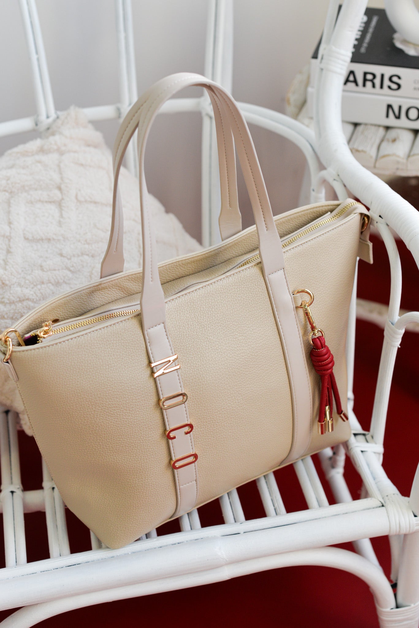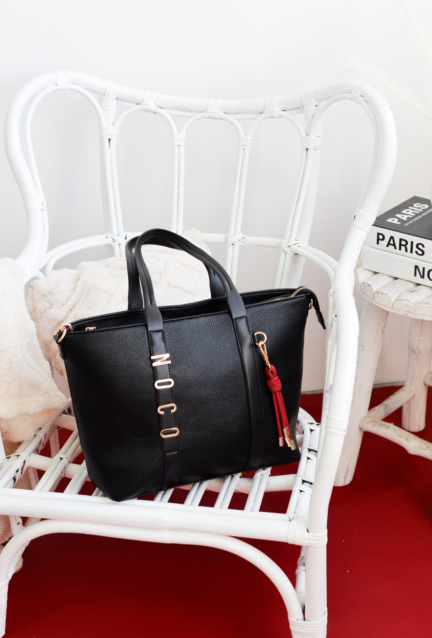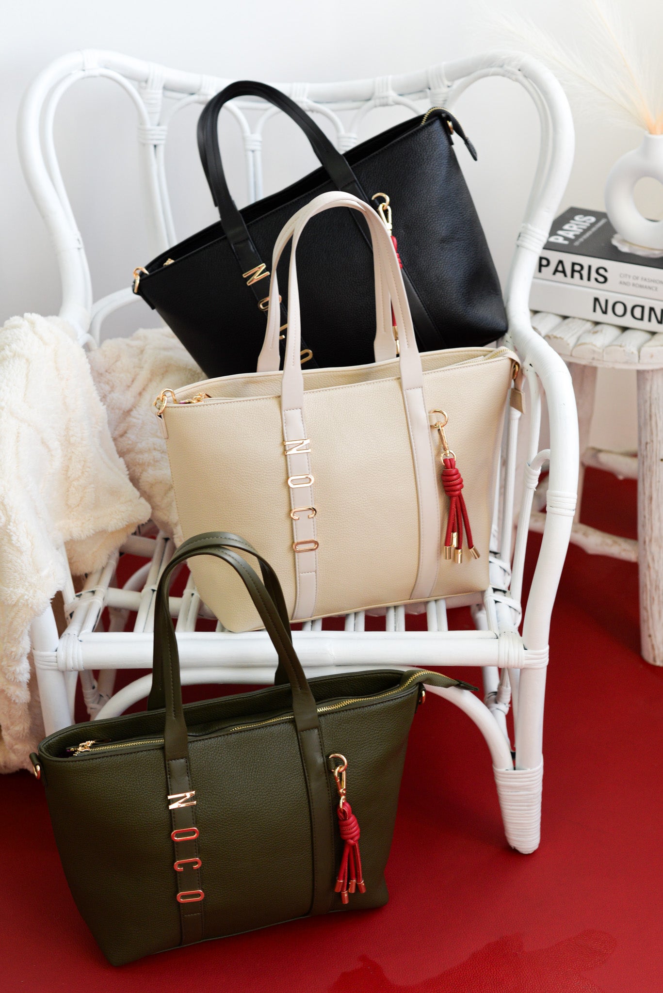 Una borsa shopper spaziosa e funzionale realizzata in similpelle. La tracolla centrale con il logo Noco in lettere metalliche dorate aggiunge un tocco sofisticato che ne esalta il design minimalista.