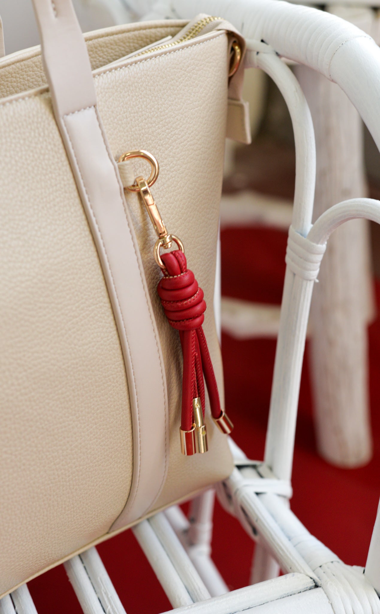 Il portachiavi rimovibile con pompon rosso aggiunge un contrasto vivace e divertente e può essere indossato anche separatamente, aggiungendo versatilità e allegria al tuo look.