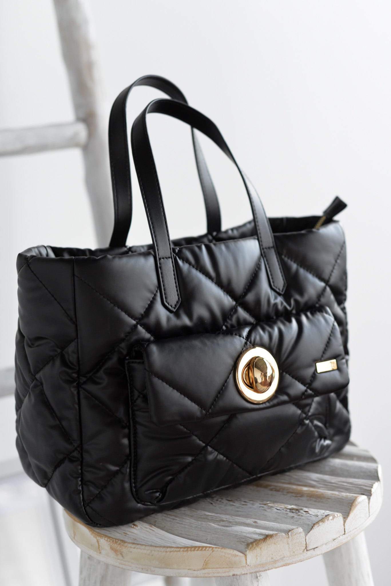 Questa borsa quadrata, realizzata in materiale tecnico trapuntato effetto piumino, coniuga praticità e design contemporaneo, perfetta per chi cerca un accessorio elegante e spazioso.