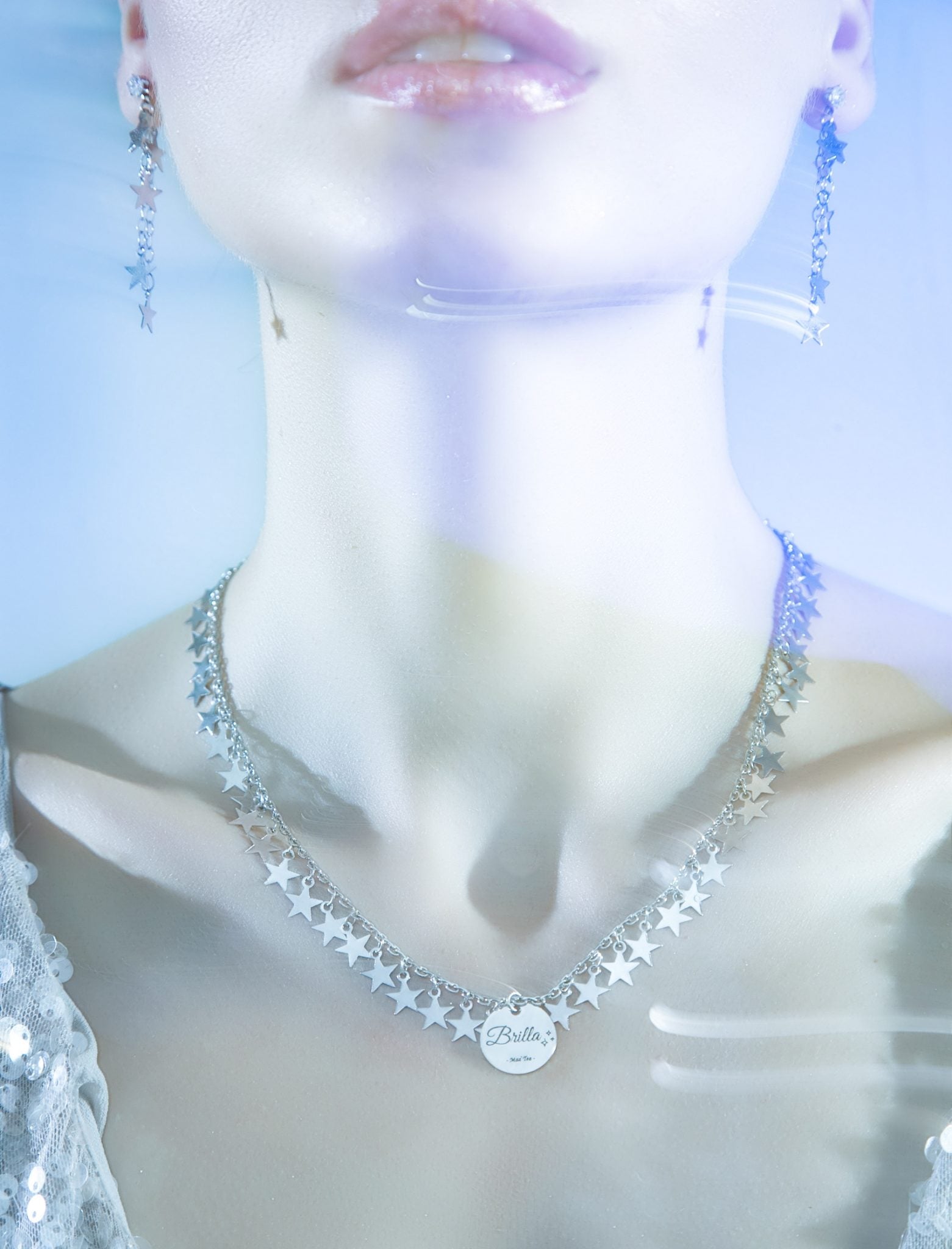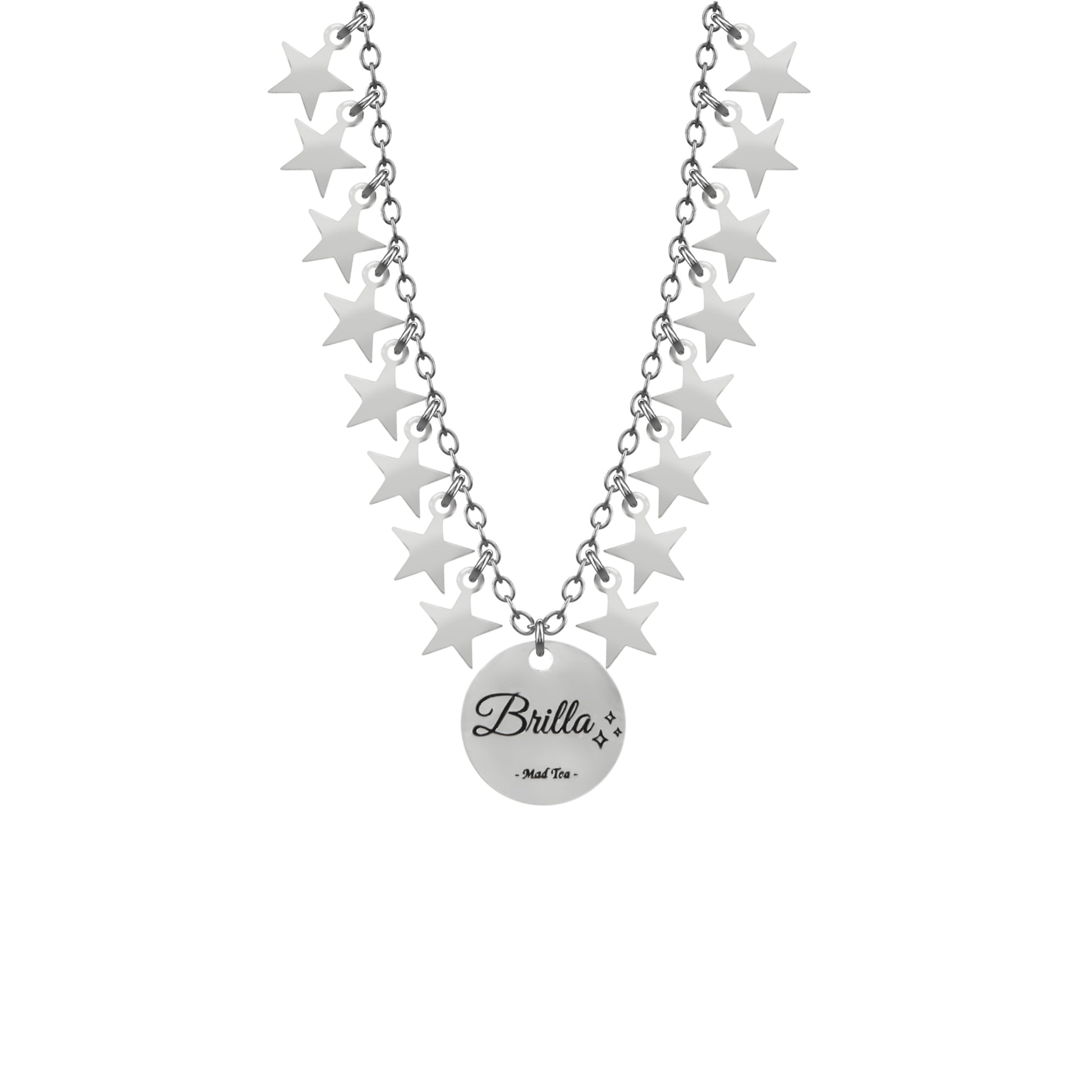 Collier di stelle in acciaio con ciondolo centrale con inciso “Brilla”.