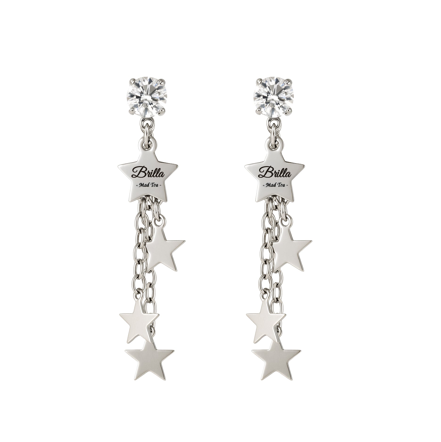 Orecchini con cascata di piccole stelle in acciaio e stella centrale con incisa la parola “Brilla”. Montatura con cristallo.