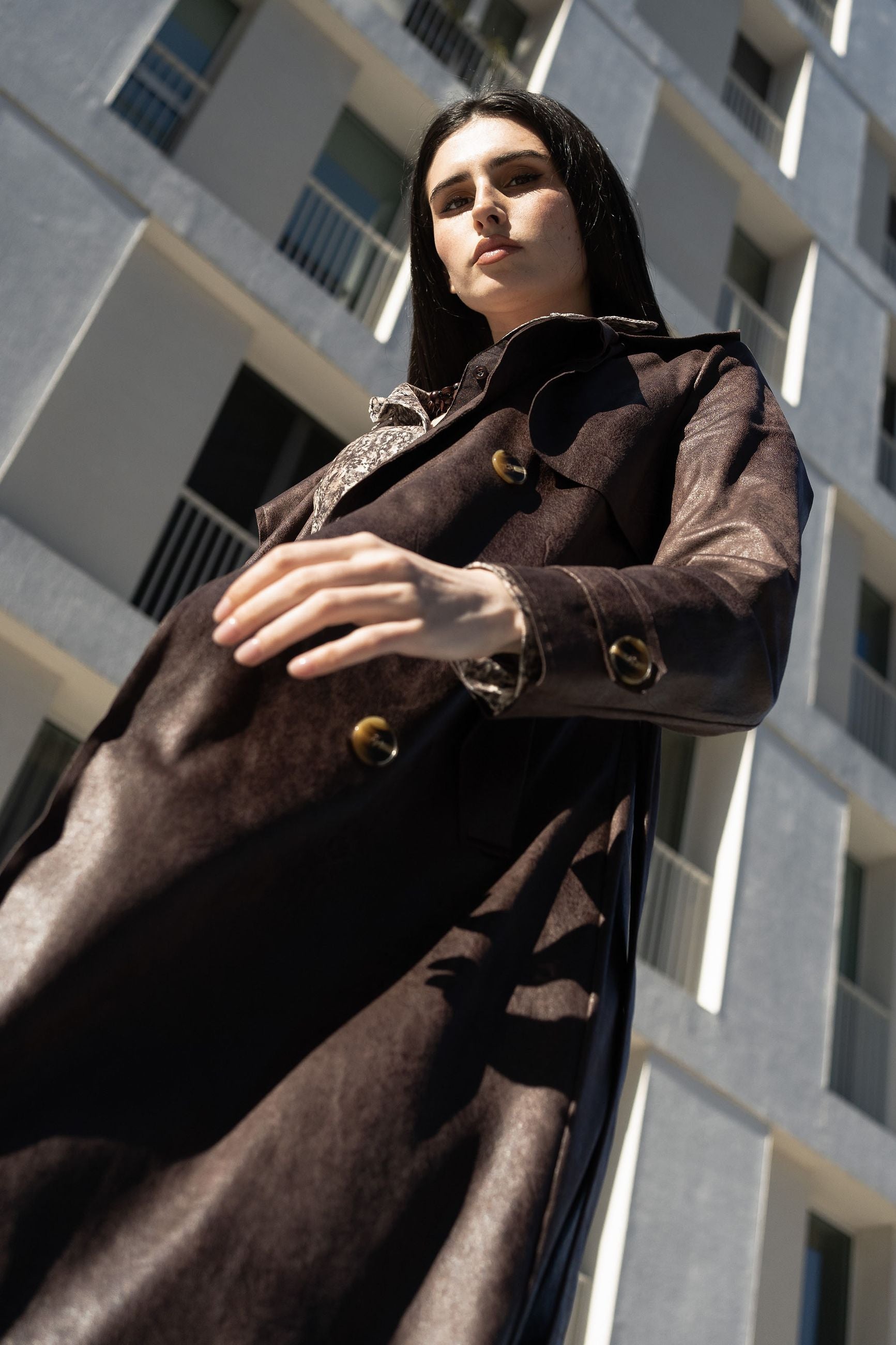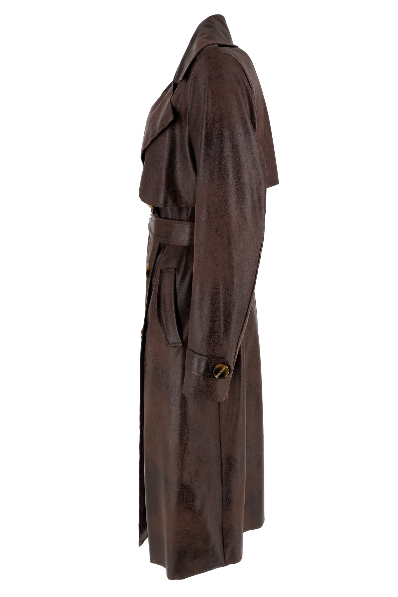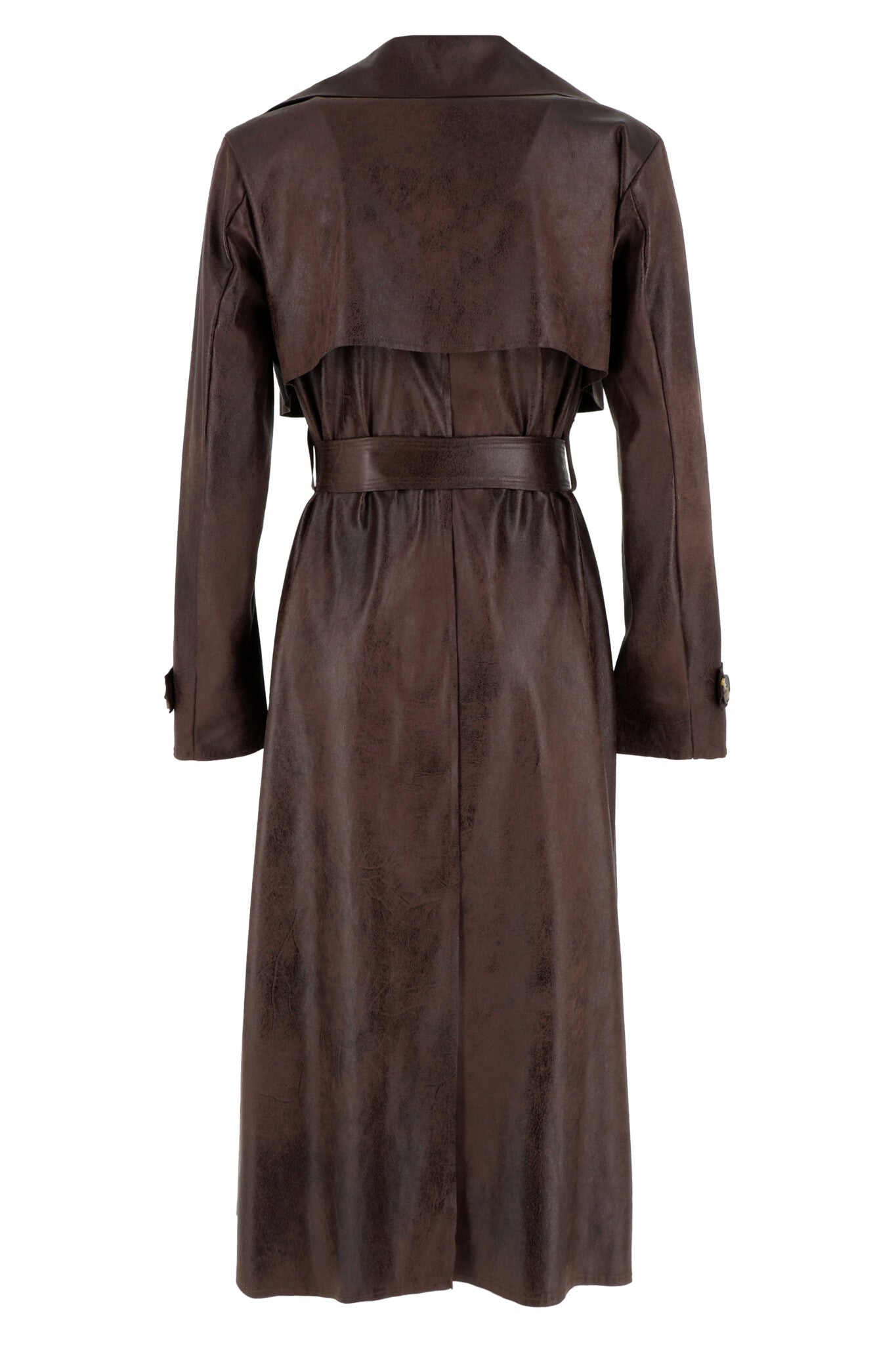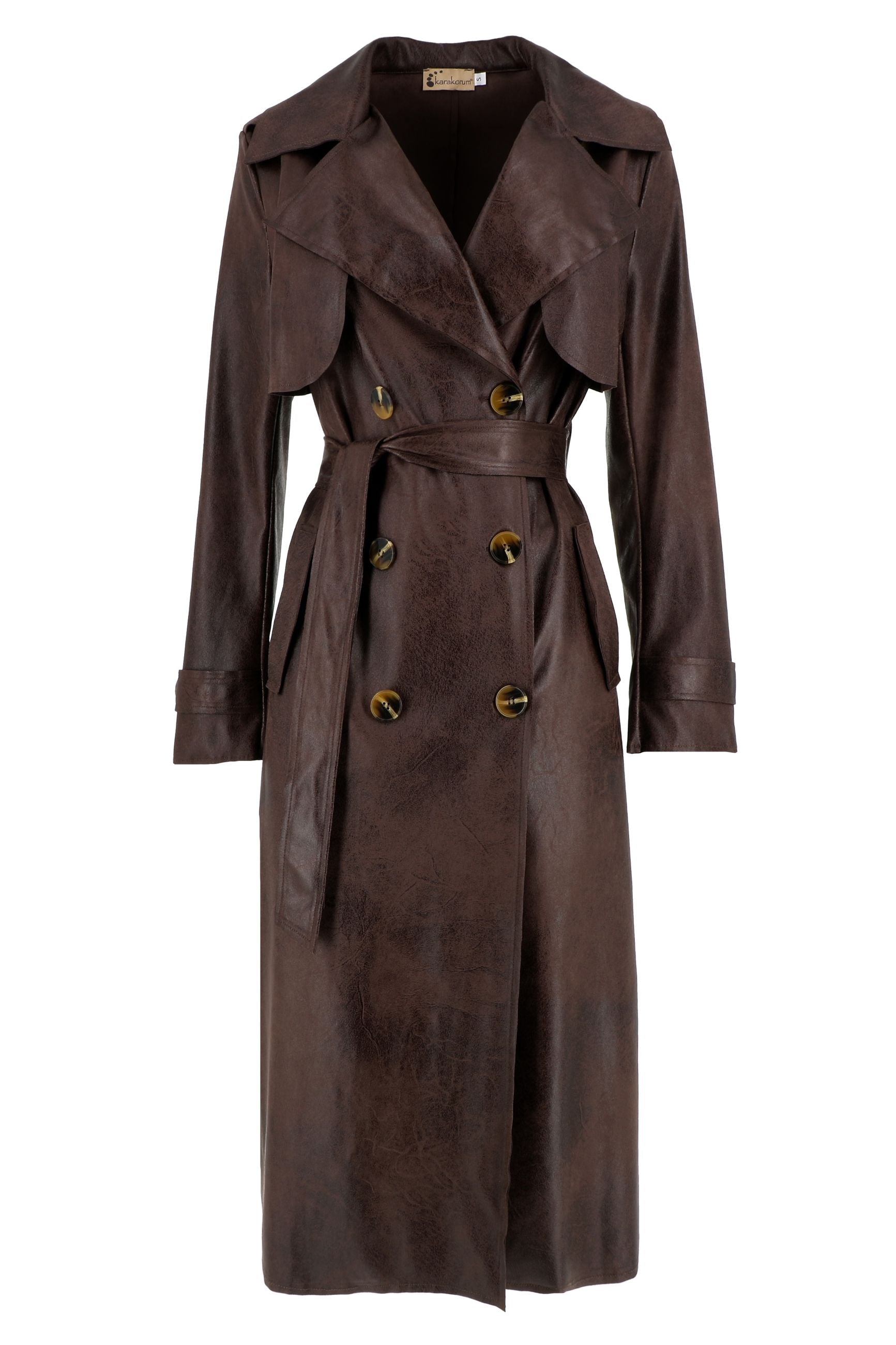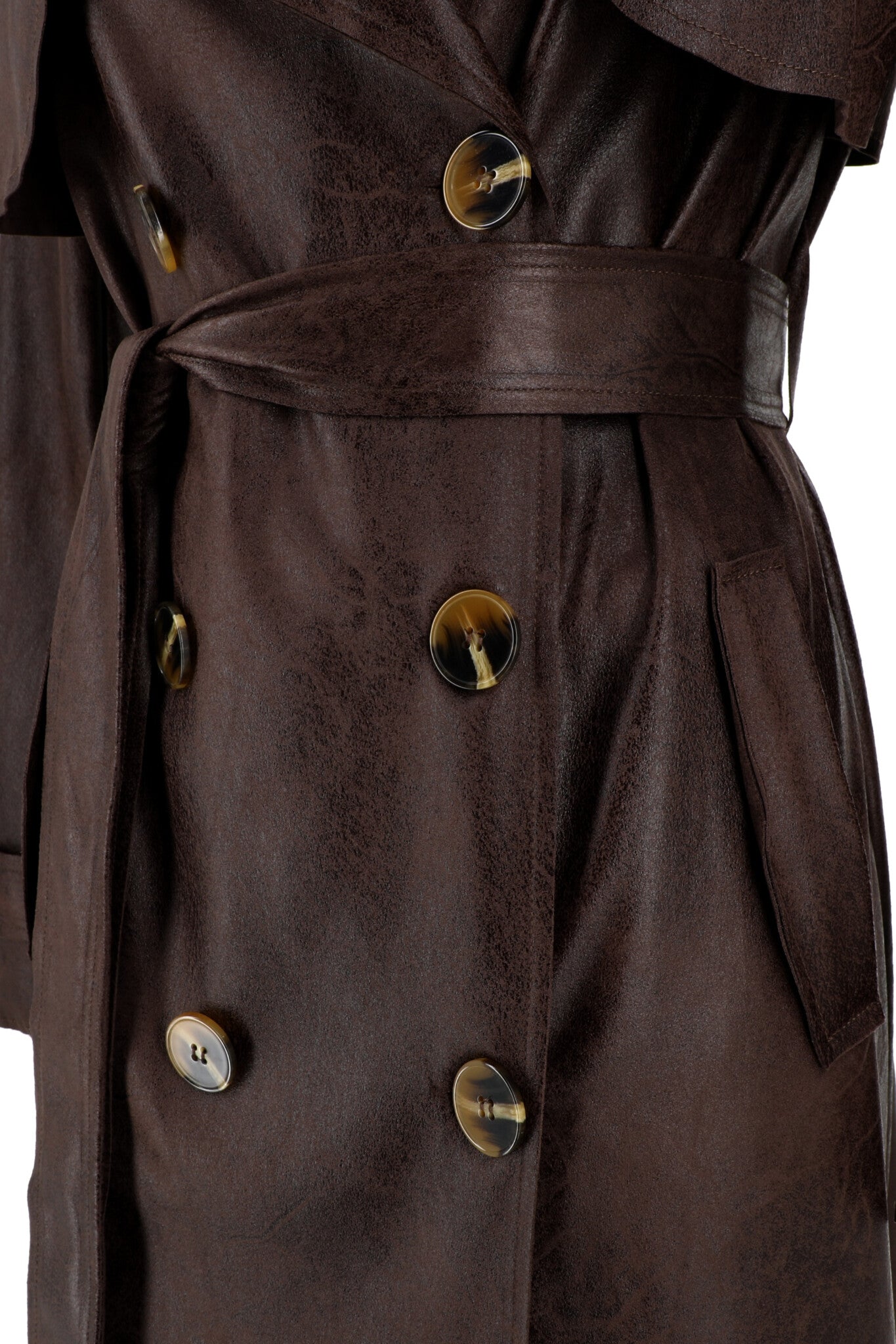 Trench lungo a doppio petto. Colletto, revers ampi e bottoni davanti. Linea morbida. Falde antivento sul davanti, una dietro. Cintura staccabile da annodare in vita. Fascetta con bottone a fondo manica, tasche anteriori oblique a filetto. Uno spacco dietro. Foderato.