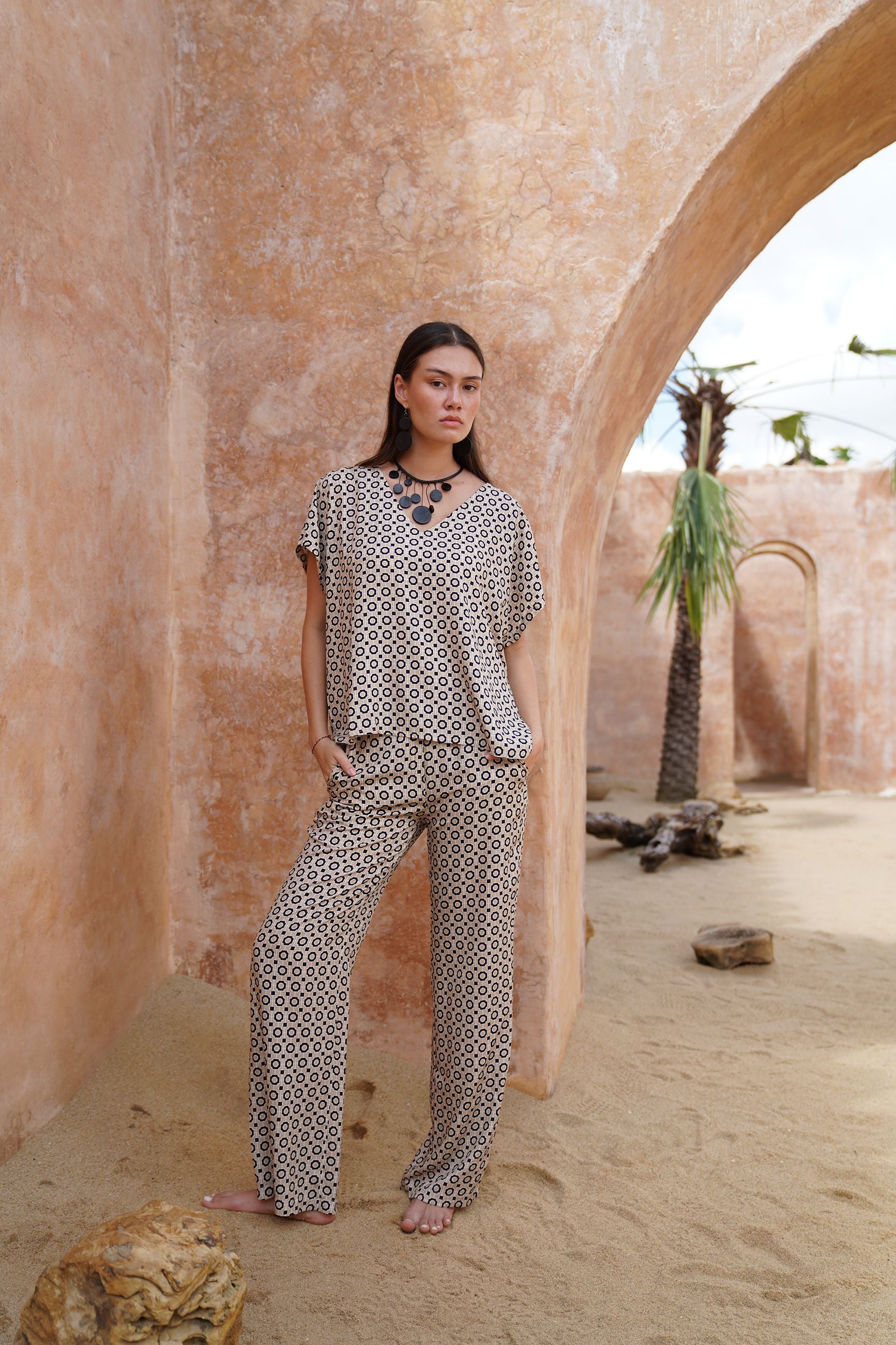 Pantaloni in morbida viscosa con elastico in vita dietro. Tasche laterali inserite.