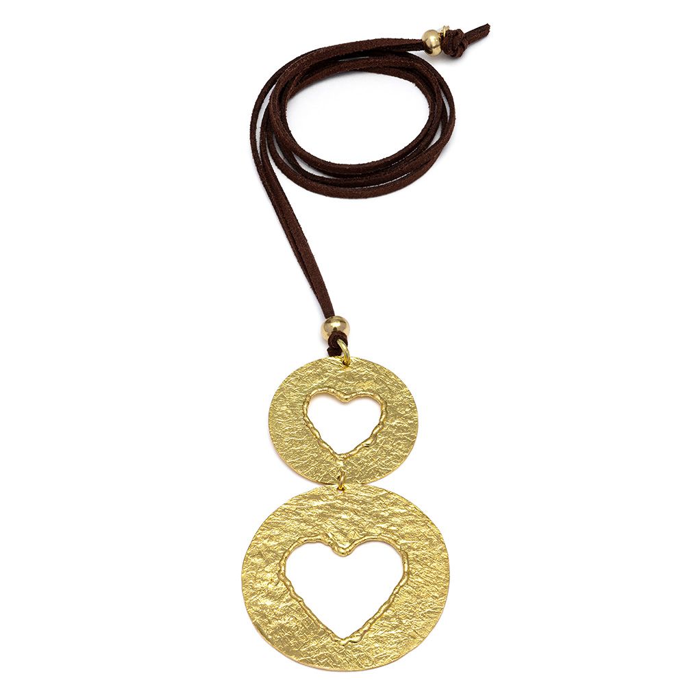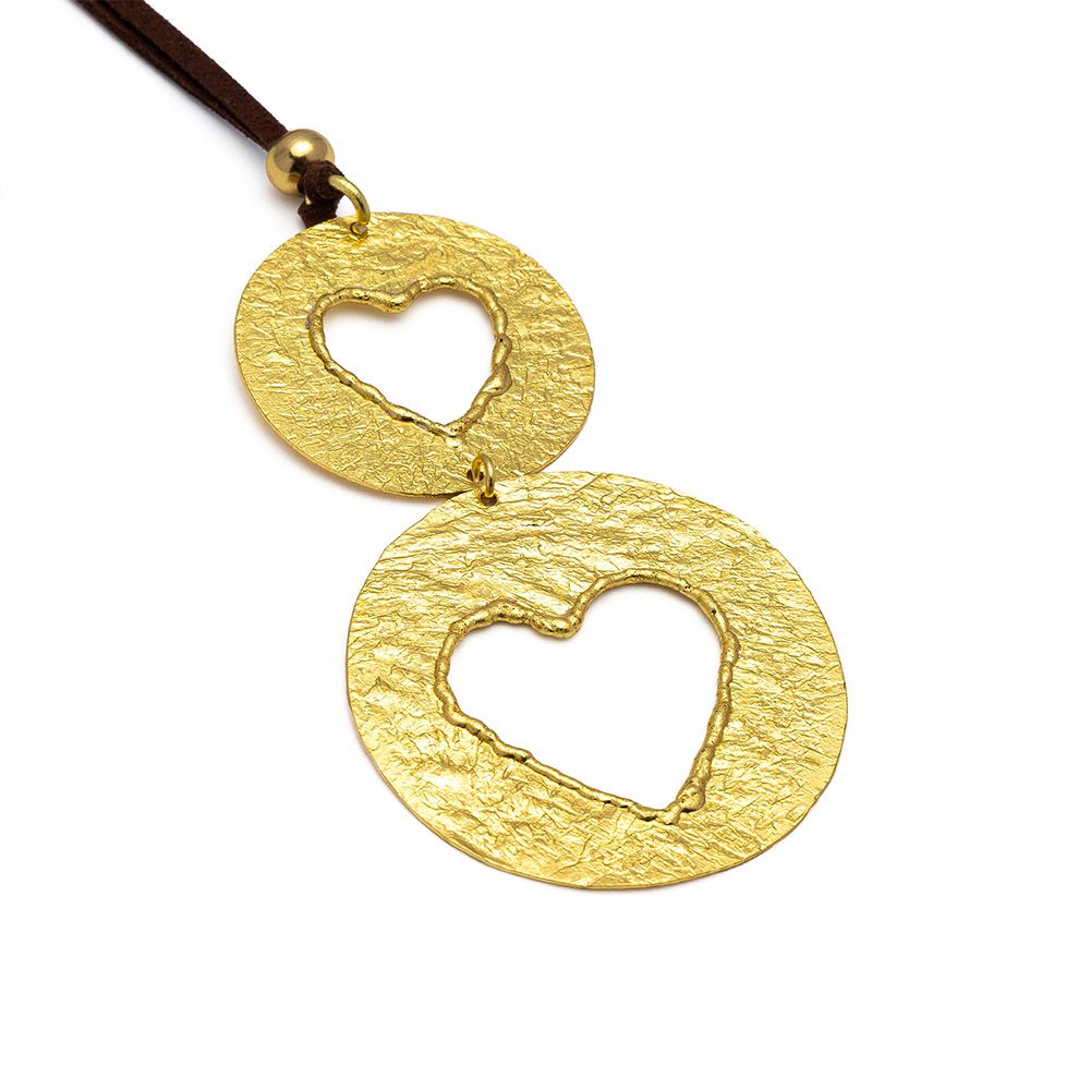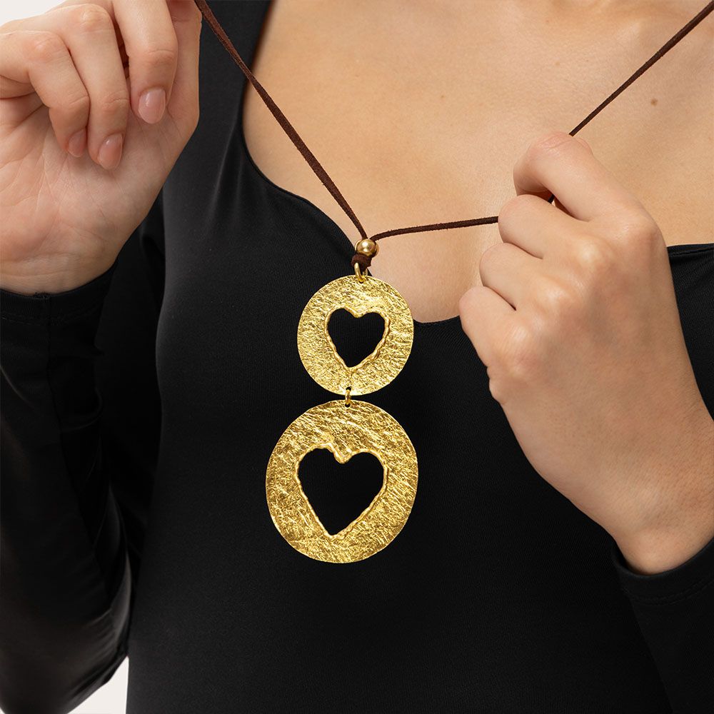 Pendente in ottone riciclato composto da due placche con design cut out di cuori e finitura battuta. Un design artigianale e romantico che unisce texture materiche a simboli romantici. Lunghezza collana 50 cm. Nickel tested. Gioielli fatti a mano, unici e artigianali, perfetti per tutti i tuoi look o come idea regalo.