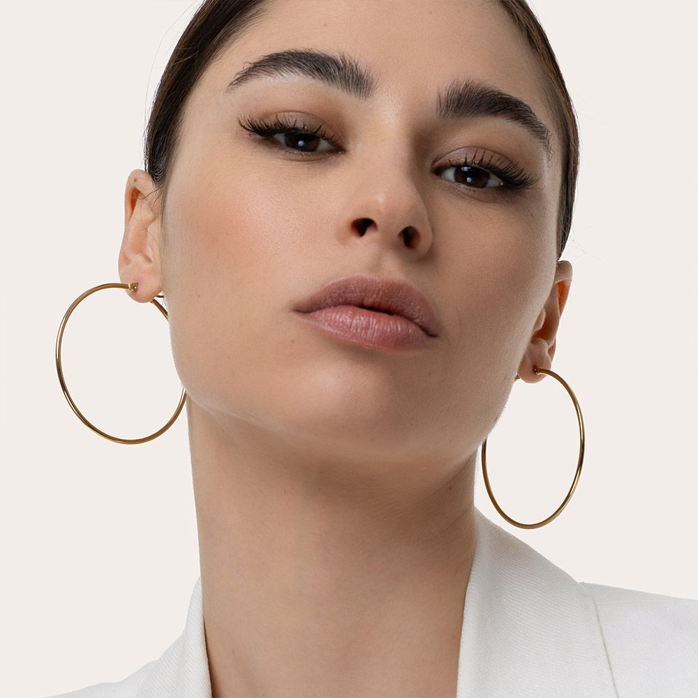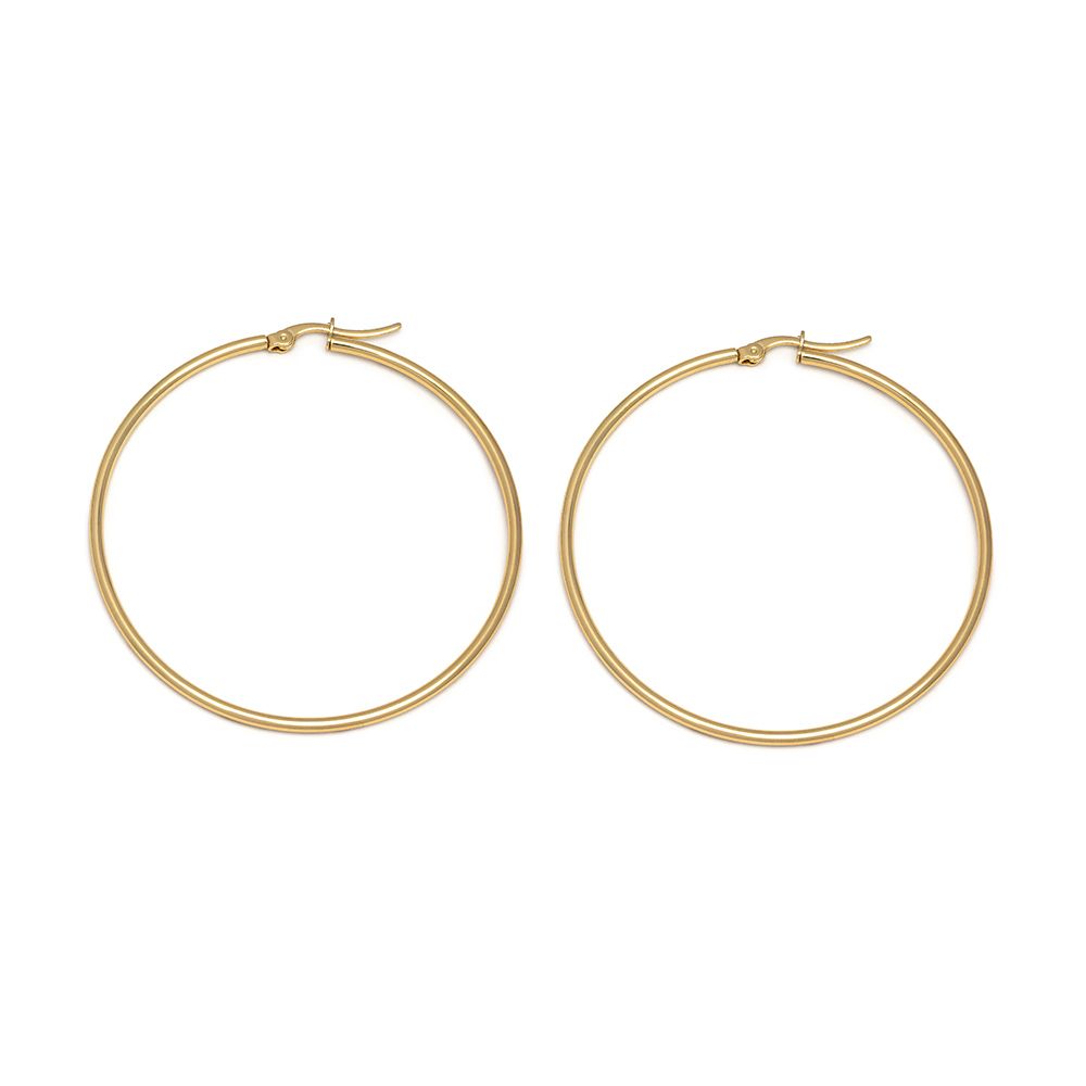 Orecchini a cerchio in acciaio gold plated modello maxi hoops dal design minimal e intramontabile. Un vero evergreen, facile da indossare e abbinare in ogni contesto. Un dettaglio essenziale per creare un evening look d'eccezione o rendere alla moda i tuoi outfit quotidiani. Chiusura a baionetta. Diametro 5,5 cm. Nickel tested.