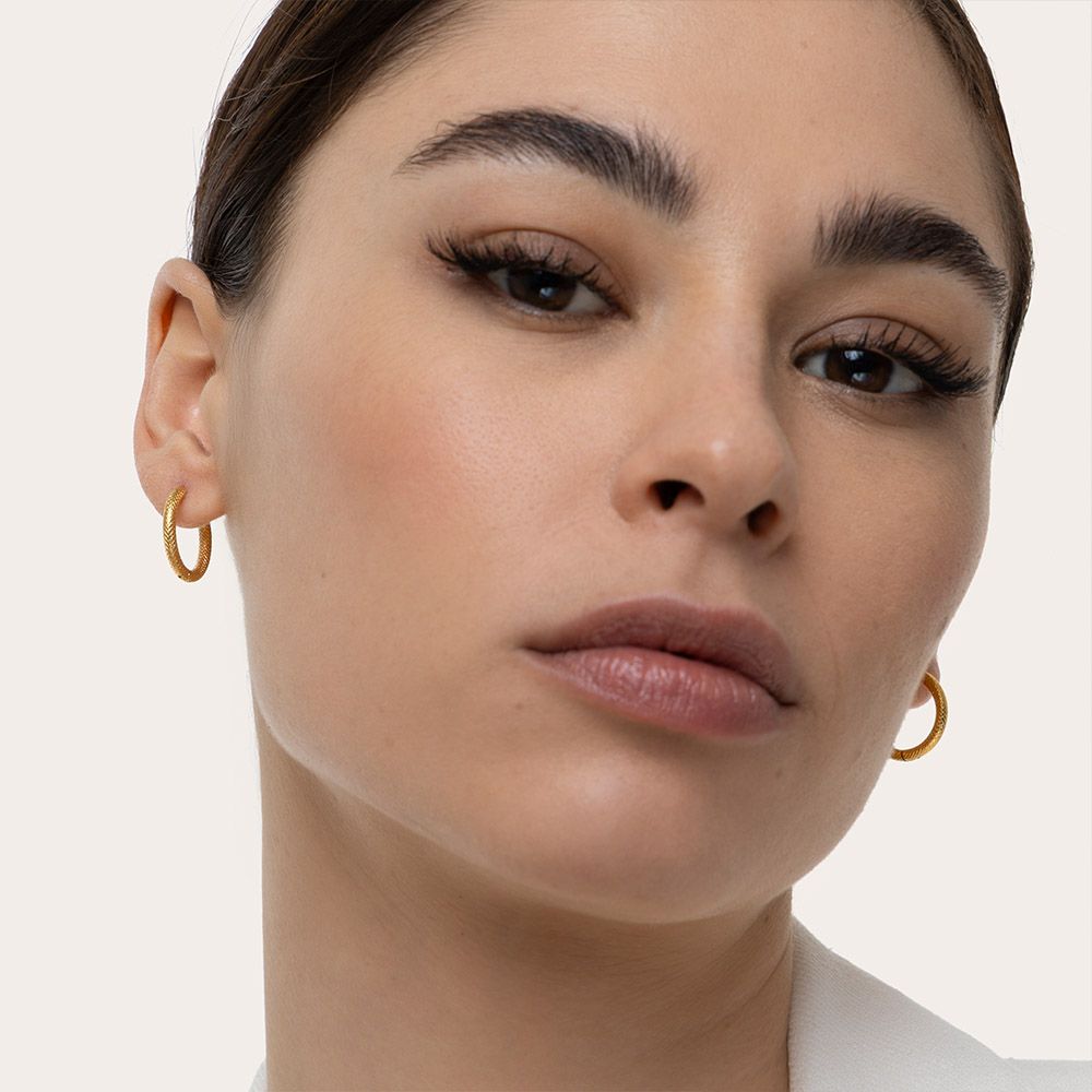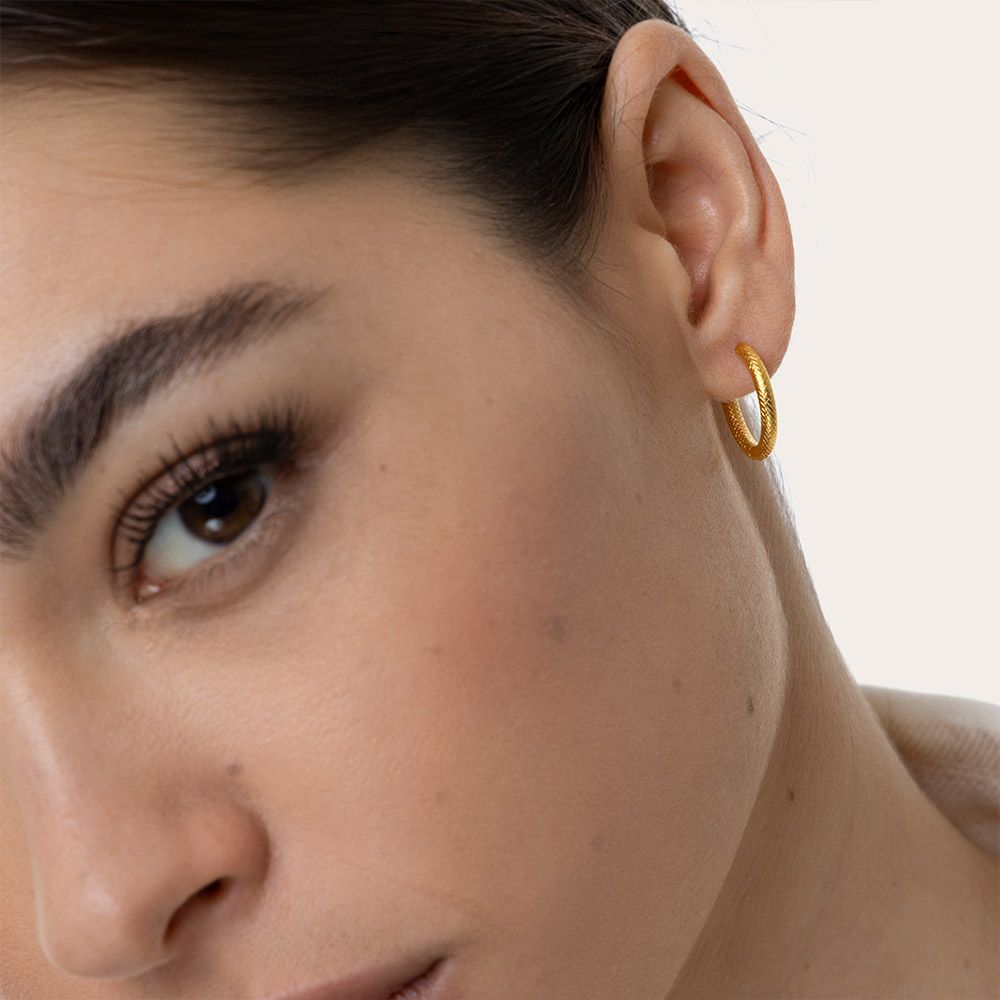 Orecchini a cerchio in acciaio gold plated modello hoops mini. Mini cerchi texturizzati, dal finish ricercato in stile "pelle di serpente" e ultra versatili. Perfetti per arricchire il tuo earrings stack con un dettaglio piccolo ma luminoso. Chiusura a scomparsa. Diametro 1 cm. Nickel tested.