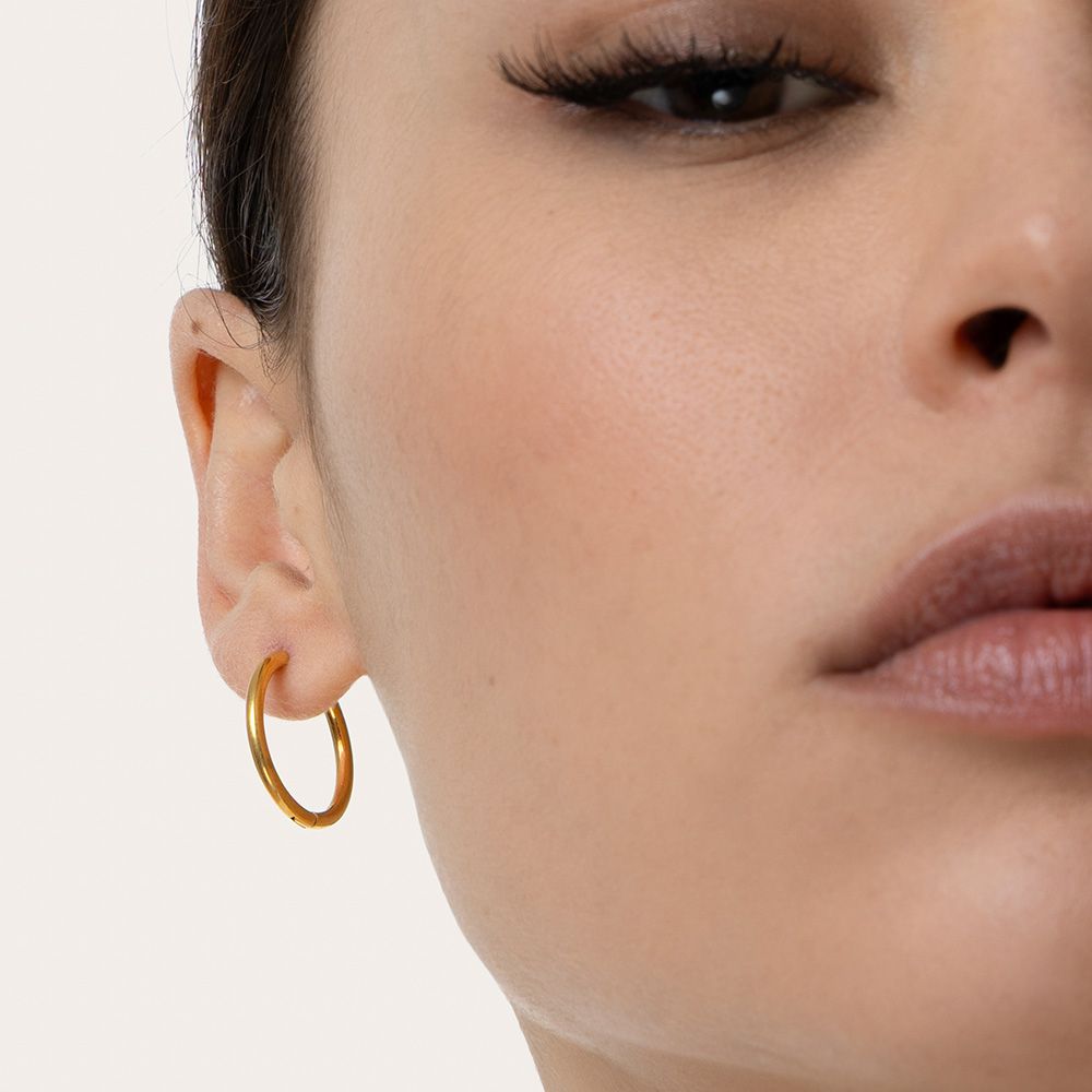 Orecchini a cerchio in acciaio gold plated modello hoops mini. Per chi ama dettagli classici ma lineari, con un design essenziale ma ricco di stile. L'essenziale fa la differenza con questo gioiello must have. Ideali per essere protagonisti oppure abbinati a modelli bold per un earrings stack glamour chic. Chiusura a scomparsa. Diametro 1,5 cm. Nickel tested.