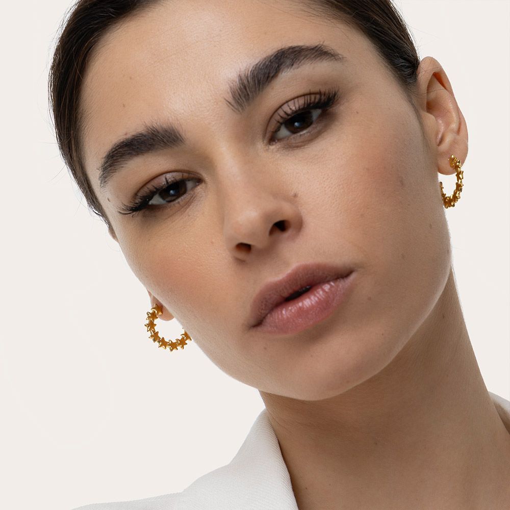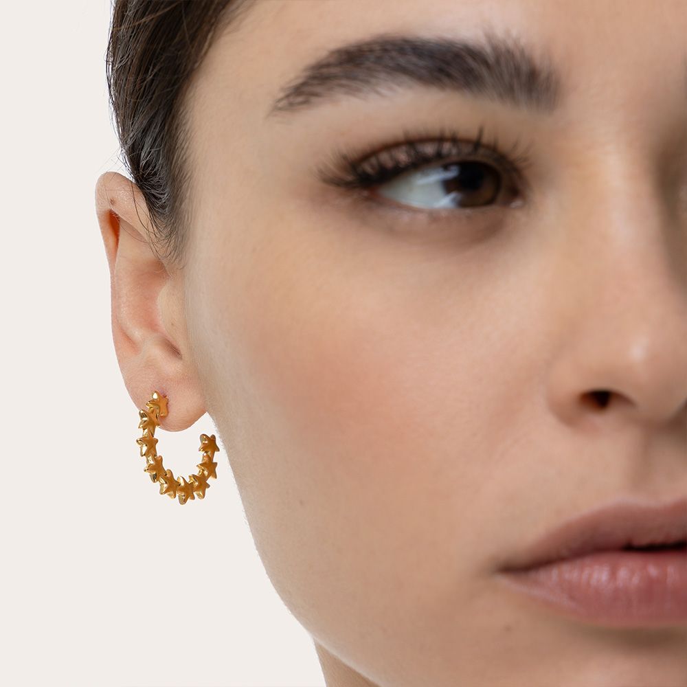 Orecchini in acciaio gold plated modello c hoop ispirati alle costellazioni. Una composizione di stelle nata per farti brillare. Un design iconico dal tocco funny che aggiunge un mood celestiale a qualsiasi look. Perfetti da portare da soli o mixati in un earrings stack pieno di luce. Nickel tested.