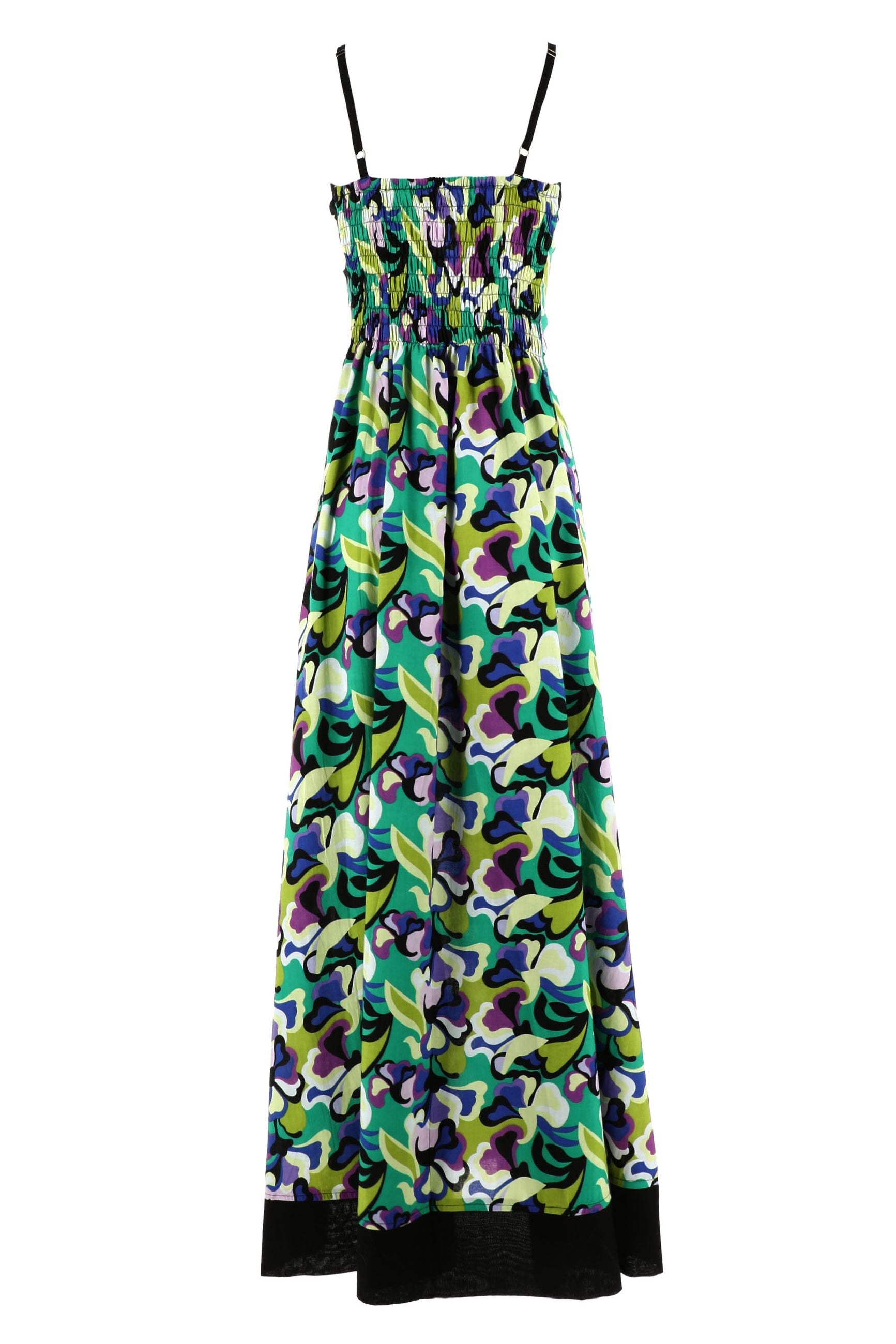 Vestito lungo in cotone stampato con spalline sottili regolabili e scollo quadrato. Fascia elastico sul retro.