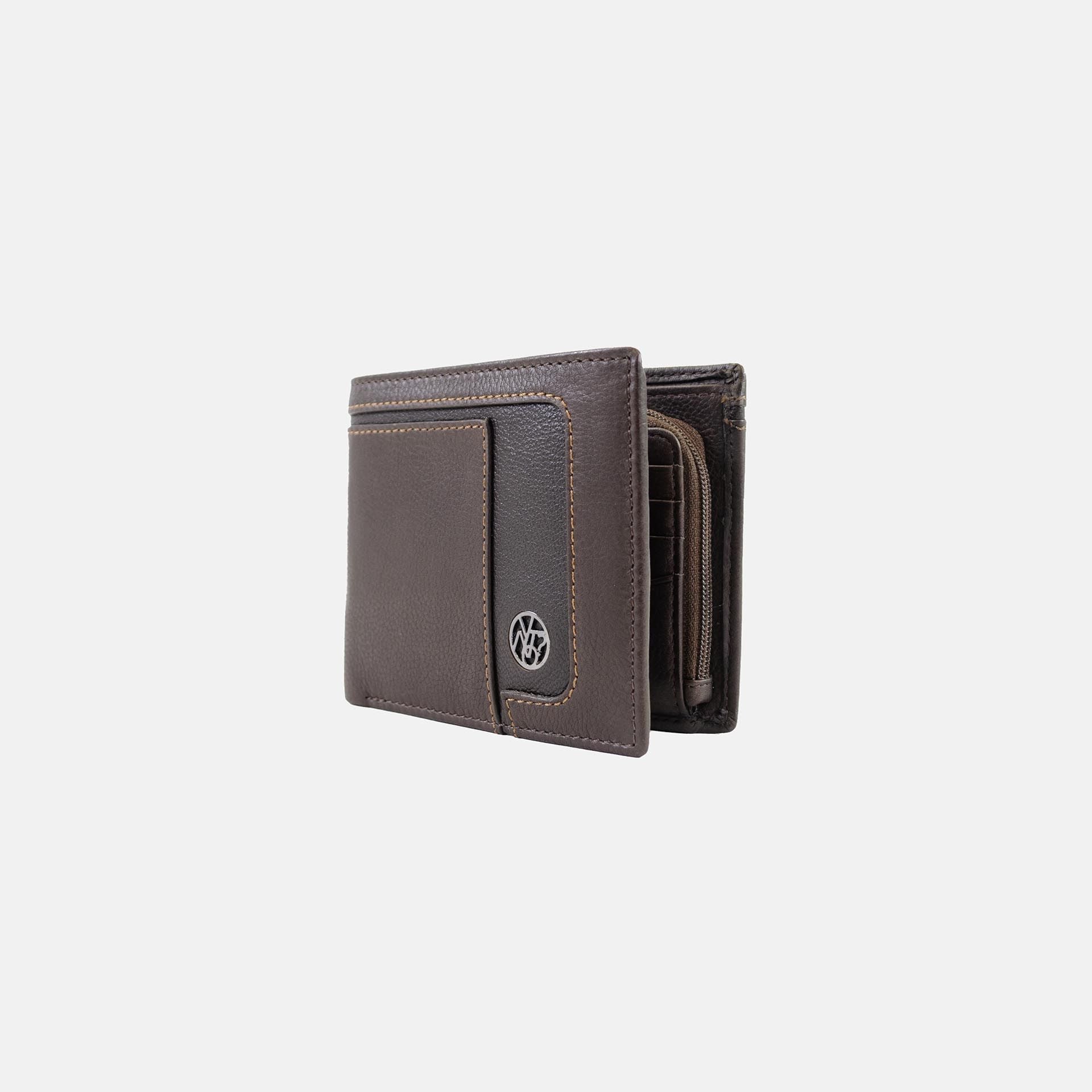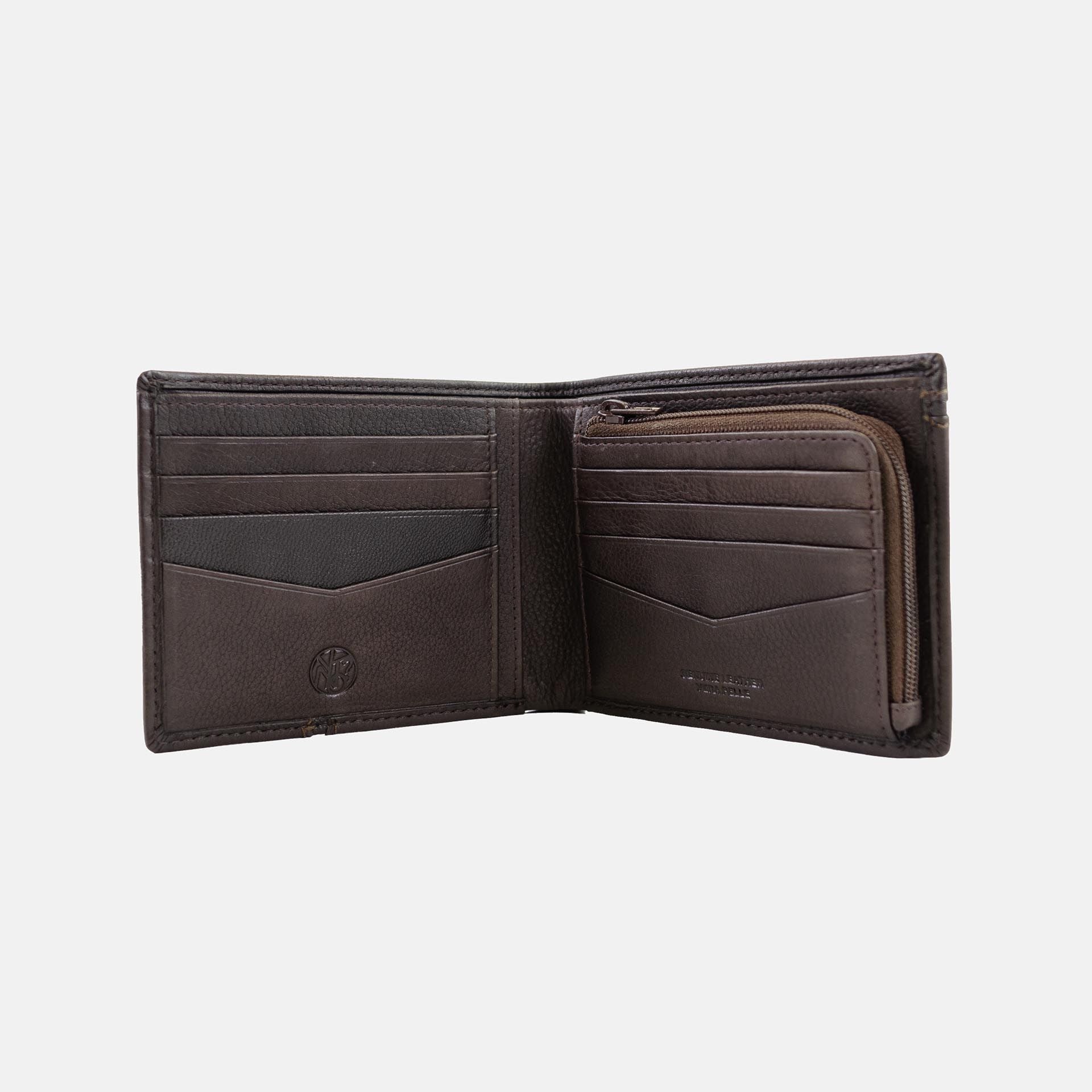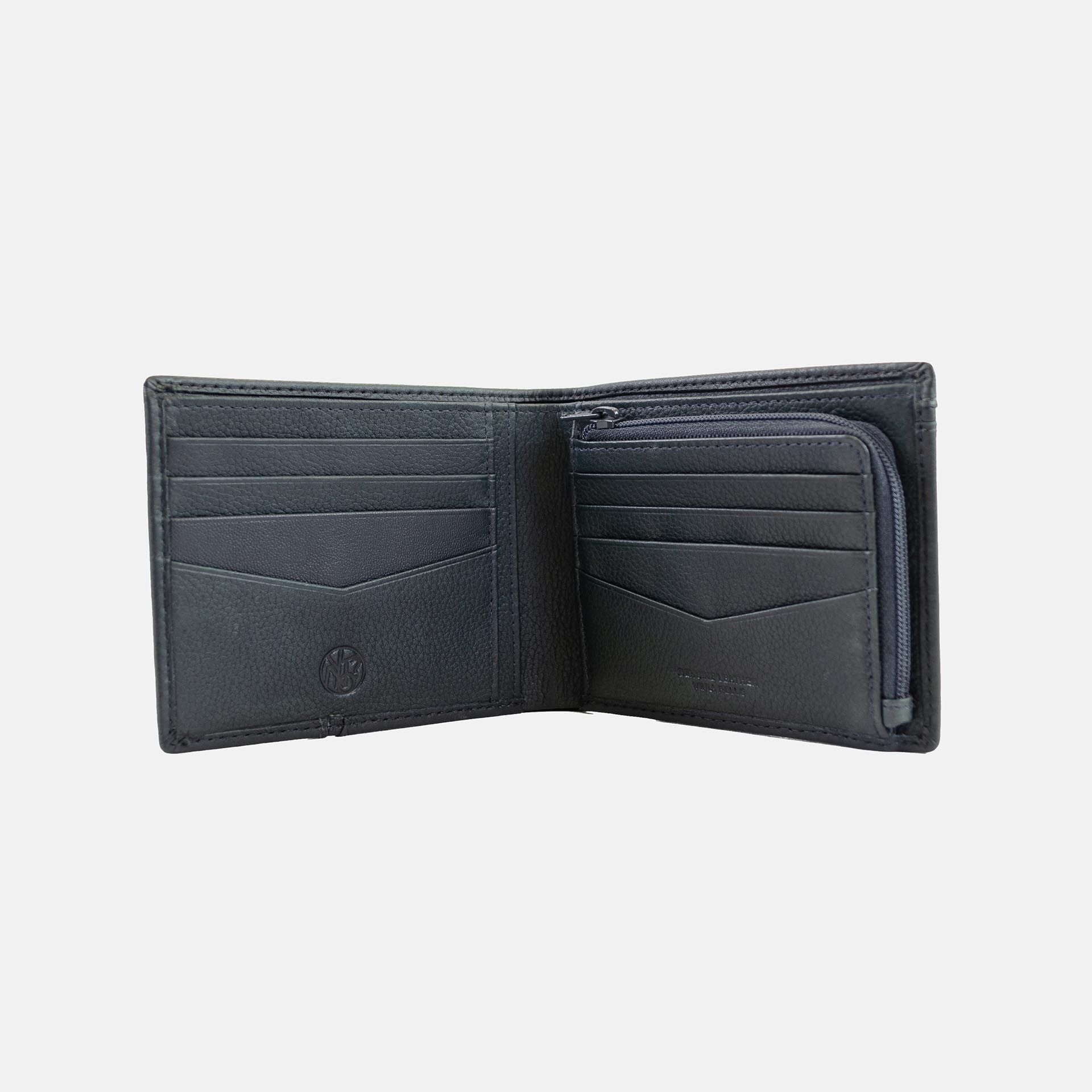 Portafogli uomo con tasca portamonete e slot dedicati alle carte. Il formato compatto 11×9 cm offre praticità senza rinunciare alla funzionalità, perfetto per l’uso quotidiano.