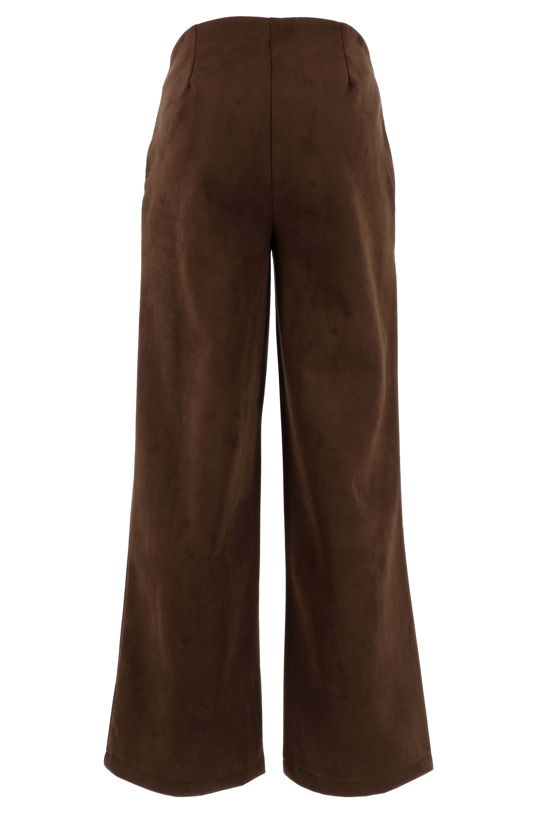 Pantaloni in morbido dainetto con tasche laterali oblique. Zip laterale. Gamba ampia e lunga alla caviglia.