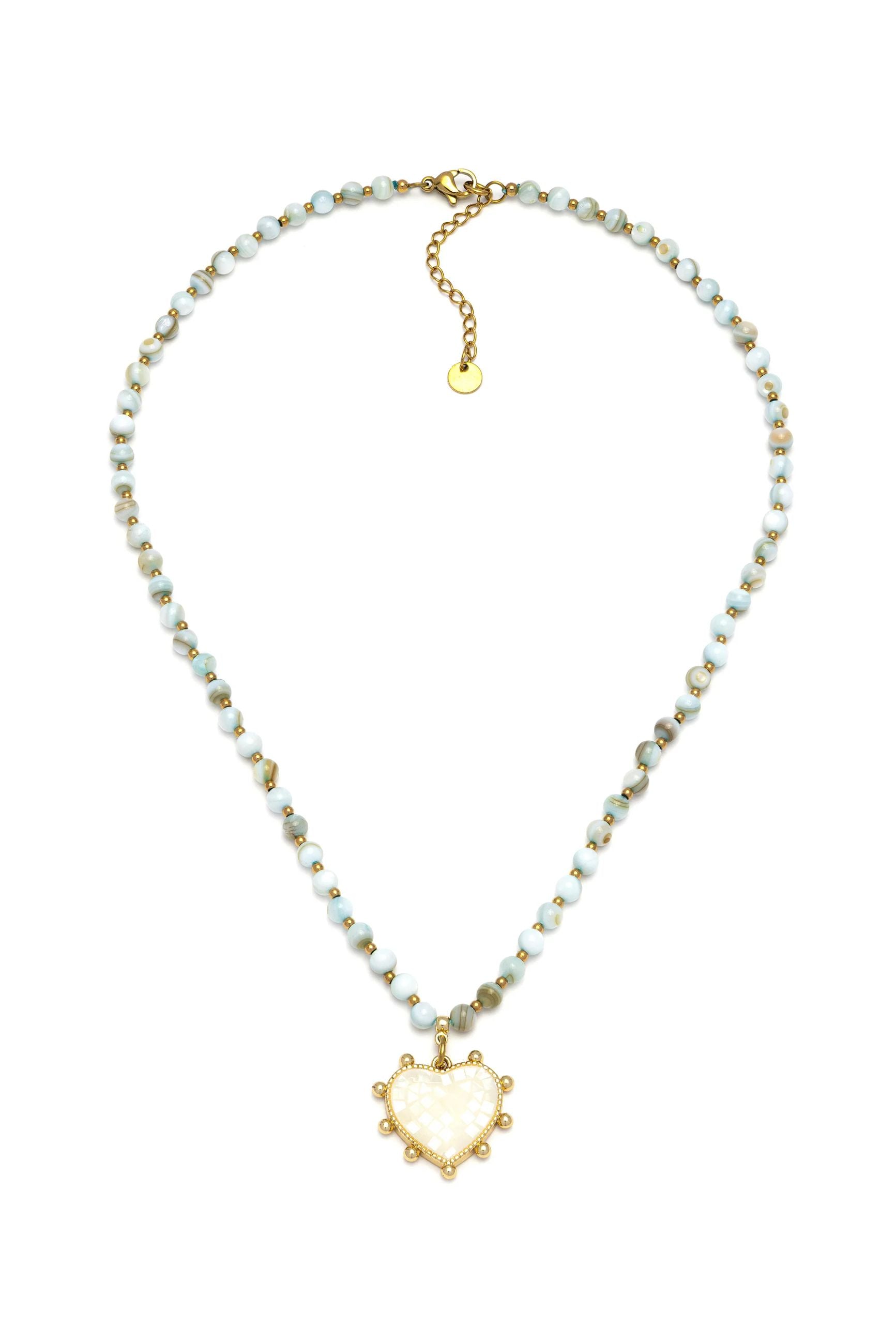 Questa collana celebra l'incontro perfetto tra il calore dell'oro e la madreperla in tonalità acquamarina cangiante. Il filo, punteggiato da piccole perline dorate, culmina in un pendente a cuore impreziosito da un mosaico di madreperla. Un gioiello dal fascino etereo, che ricorda vibrazioni marine e avventura. Perfetto per chi cerca un accessorio versatile, ideale da indossare dal giorno alla sera.