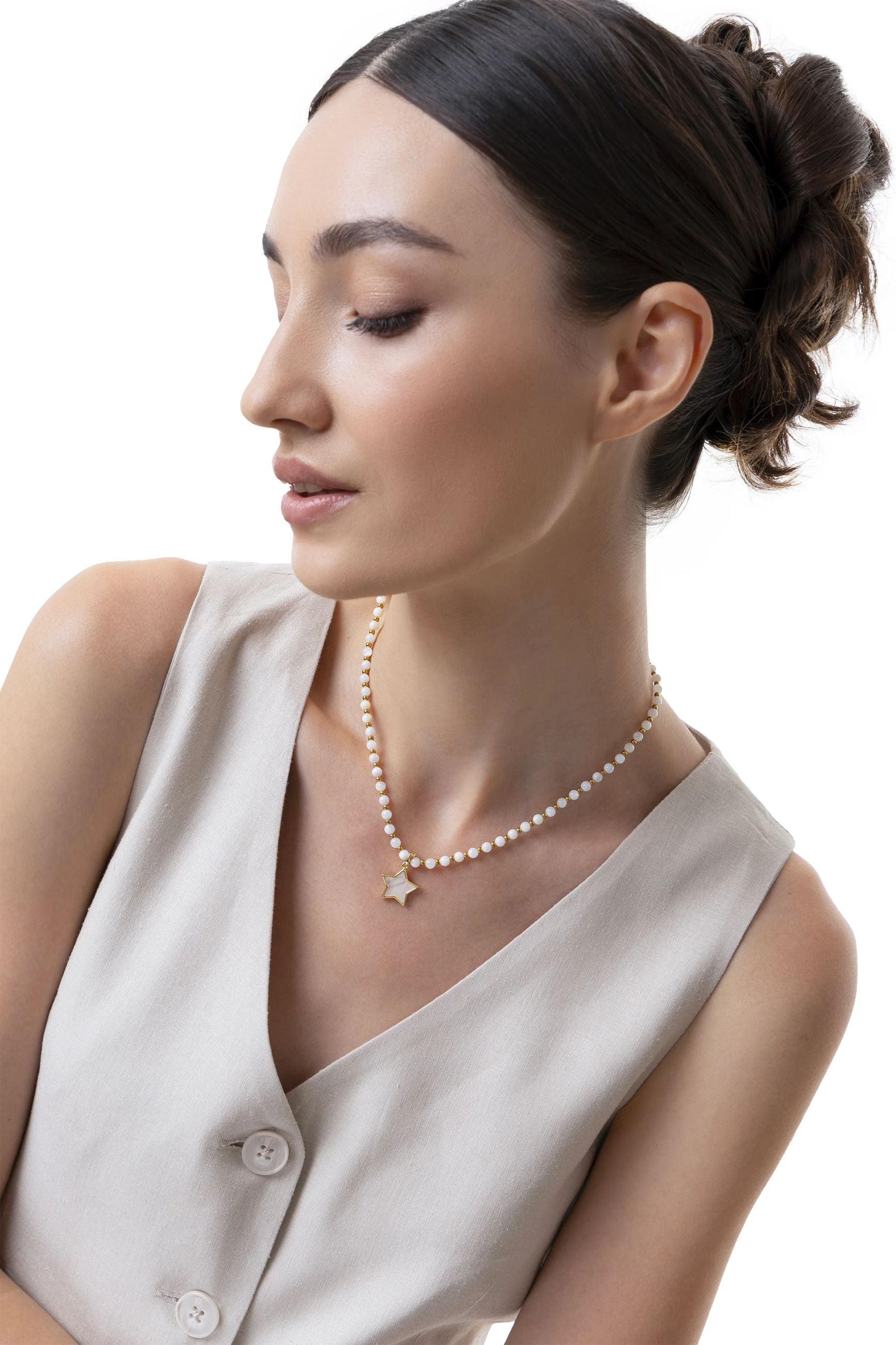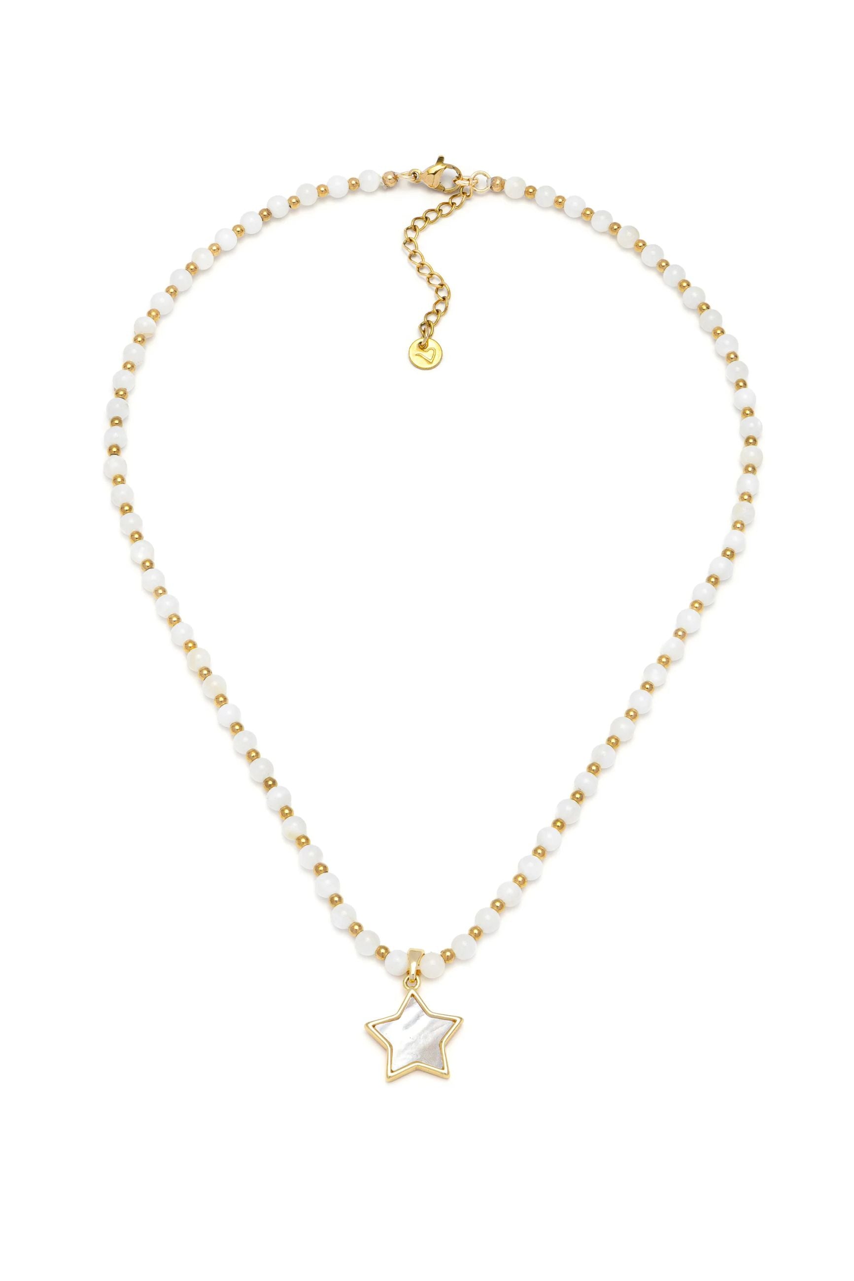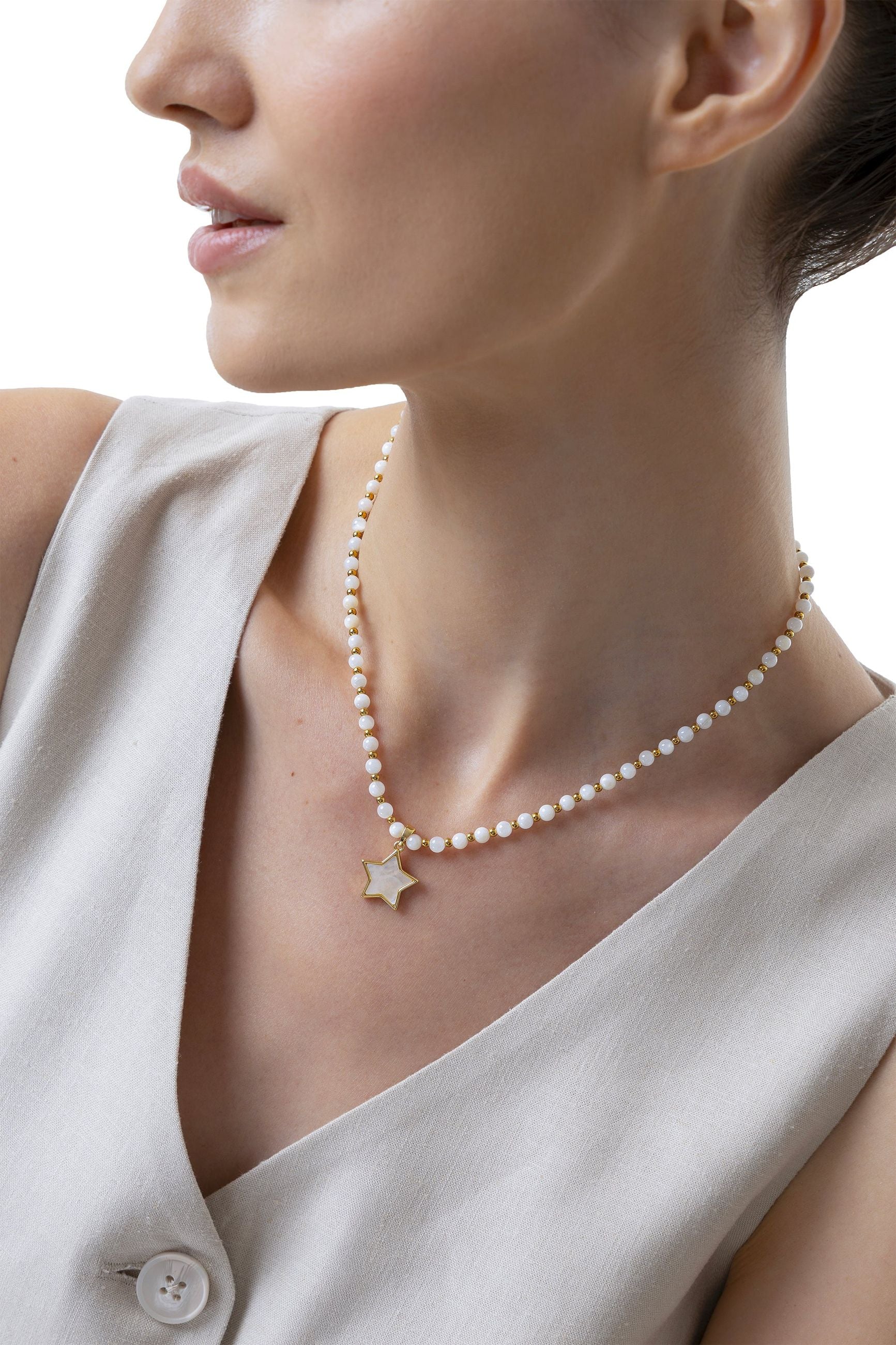 Lasciati ispirare dal fascino celestiale della Collana Stella, composta da sfere in madreperla e un luminoso charm a forma di stella. La silhouette pulita del pendente racchiude la naturale iridescenza della pietra. Un gioiello timeless dallo stile chic contemporaneo, perfetto come idea regalo per chi desidera portare sempre con sé un tocco di luce, ideale per completare ogni look con eleganza.
