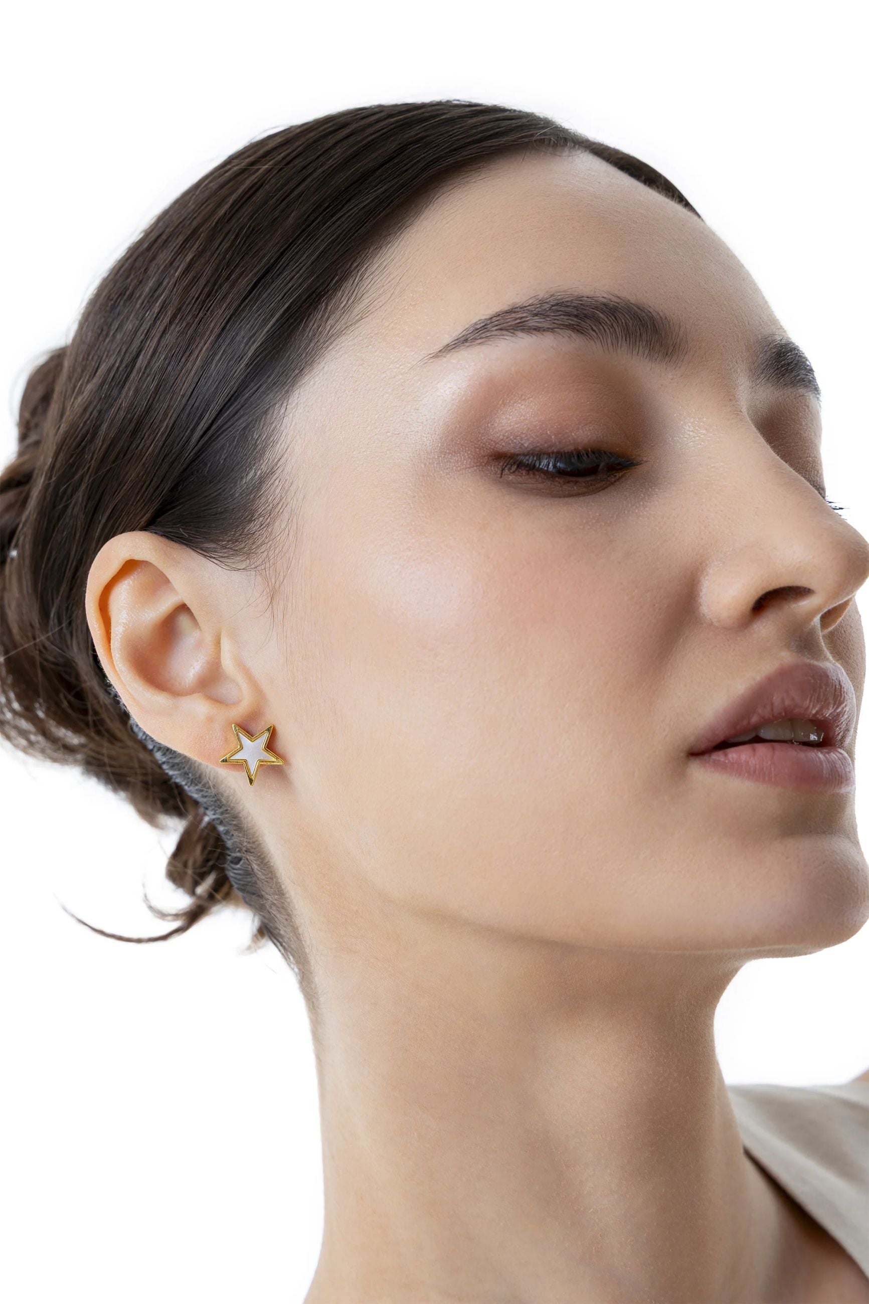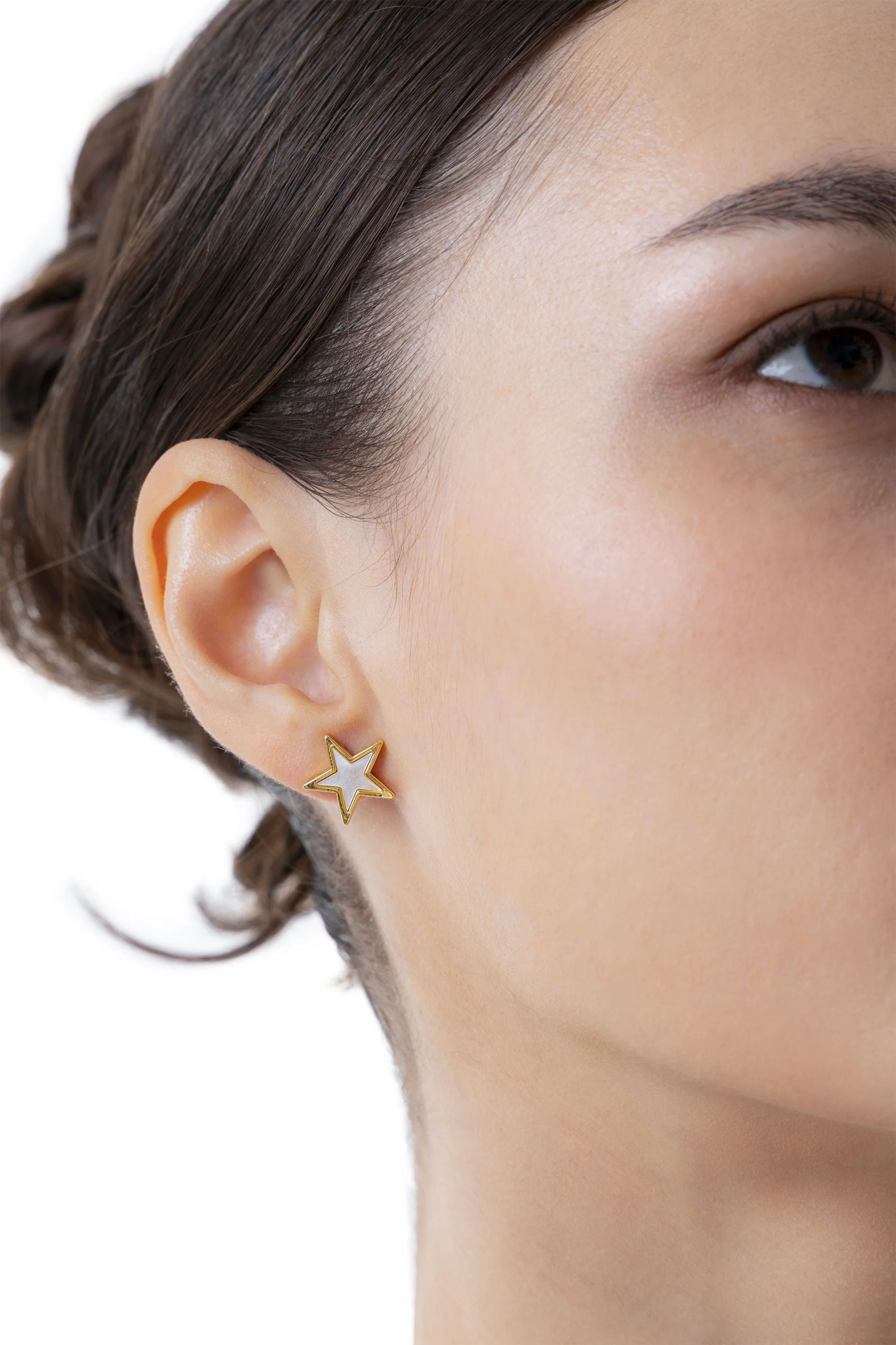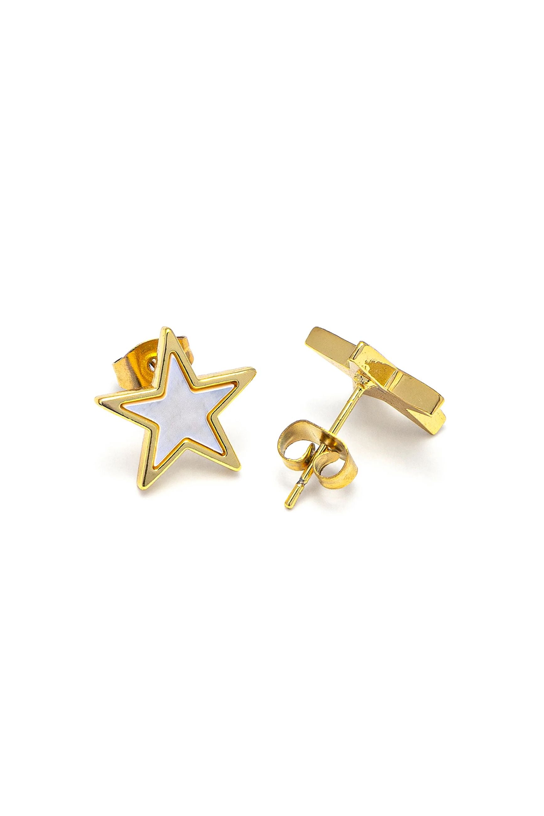Orecchini a lobo a forma di stella con un inserto in madreperla su base in acciaio placcato oro. Un gioiello timeless dallo stile chic contemporaneo, perfetto come idea regalo per chi desidera portare sempre con sé un tocco di luce. Ideali in abbinamento con la "Collana Stella" o con il "Bracciale Elastico Stella". Chiusura a perno con farfallina.