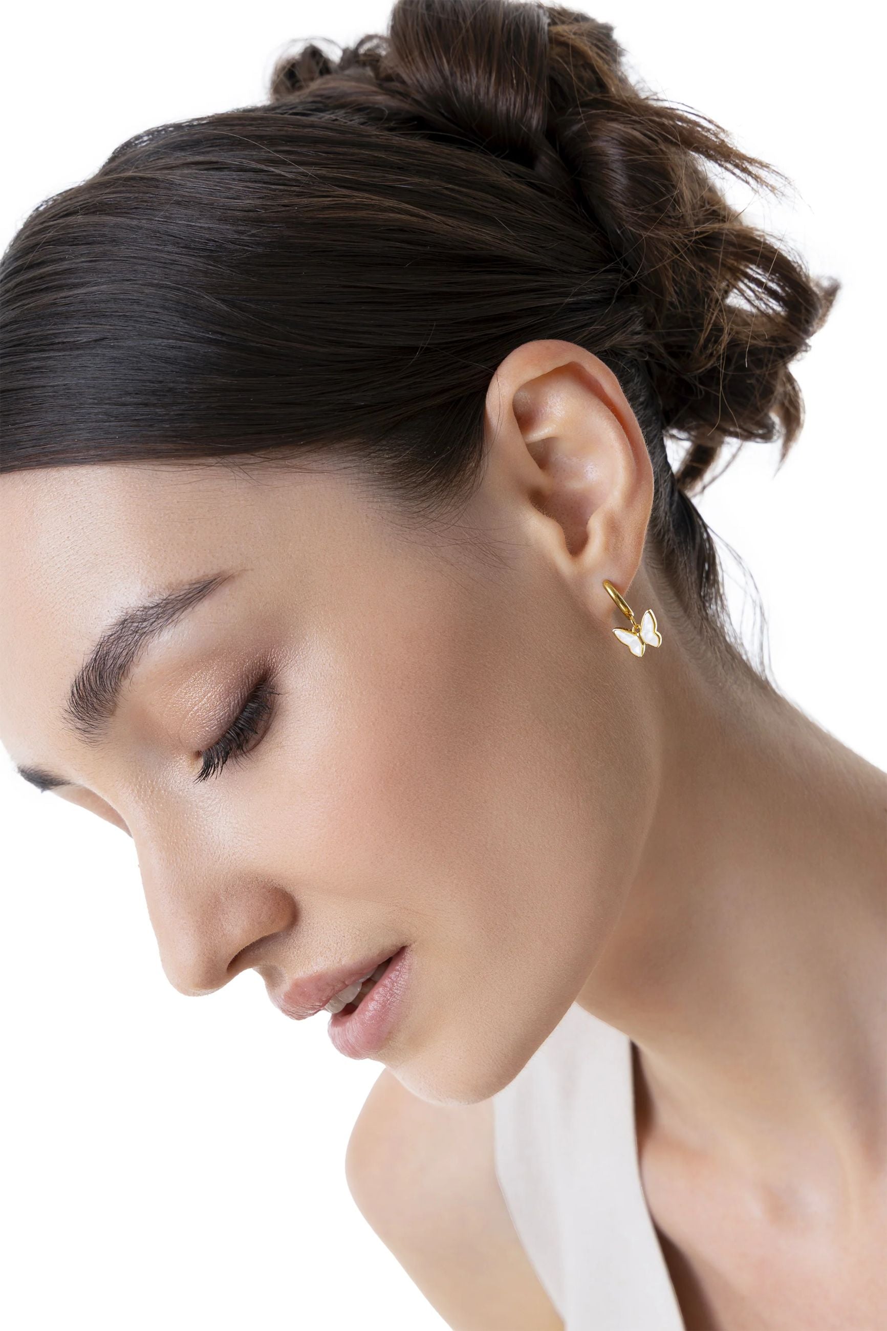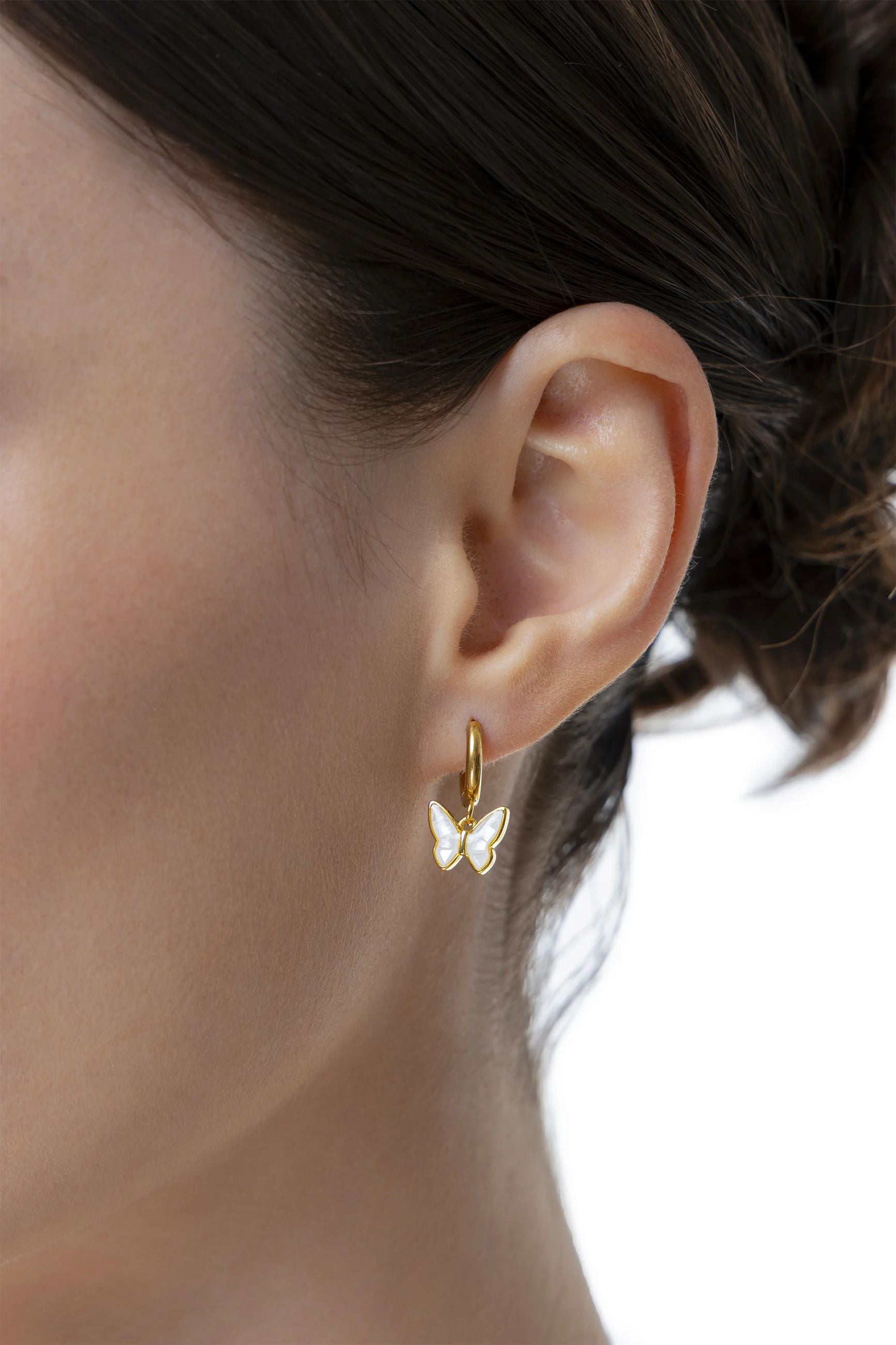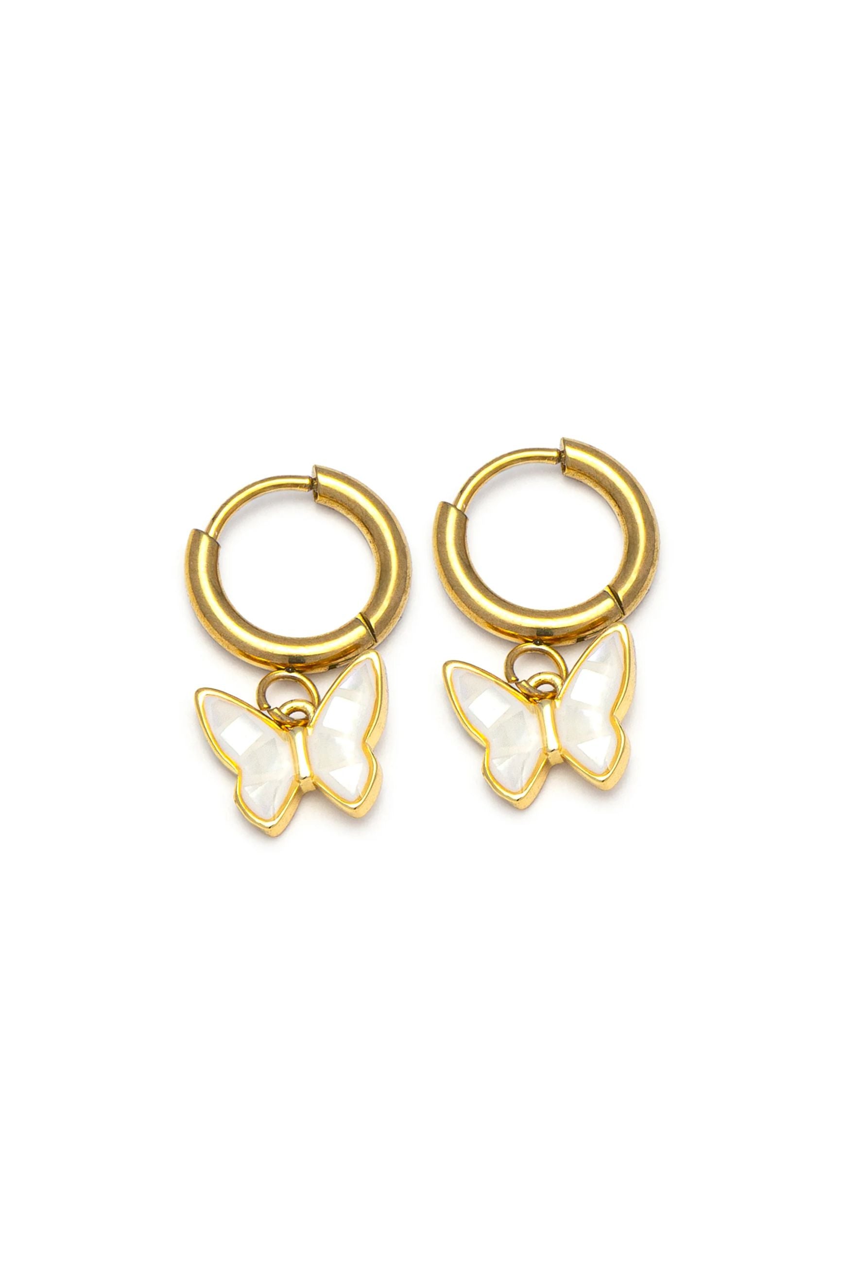 Orecchini a cerchio piccolo con charm a forma di farfalla in madreperla. Modello pensato per completare il set con il "Bracciale Elastico Farfalla". Un dettaglio femminile per il tuo look quotidiano. Chiusura a scatto con perno. Diametro cerchio: 0,8 cm.