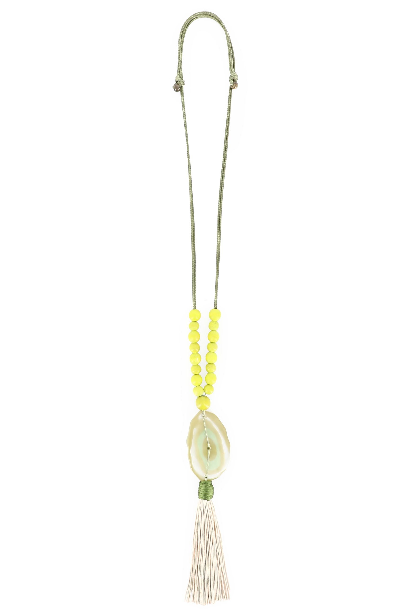 Collana in corda spalmata, a lunghezza regolabile, con pendente a frange in corda, ovale centrale, irregolare, in resina dipinta e pallotte in legno. Essendo di materiale naturale, ogni imperfezione è caratteristica dell’articolo.
