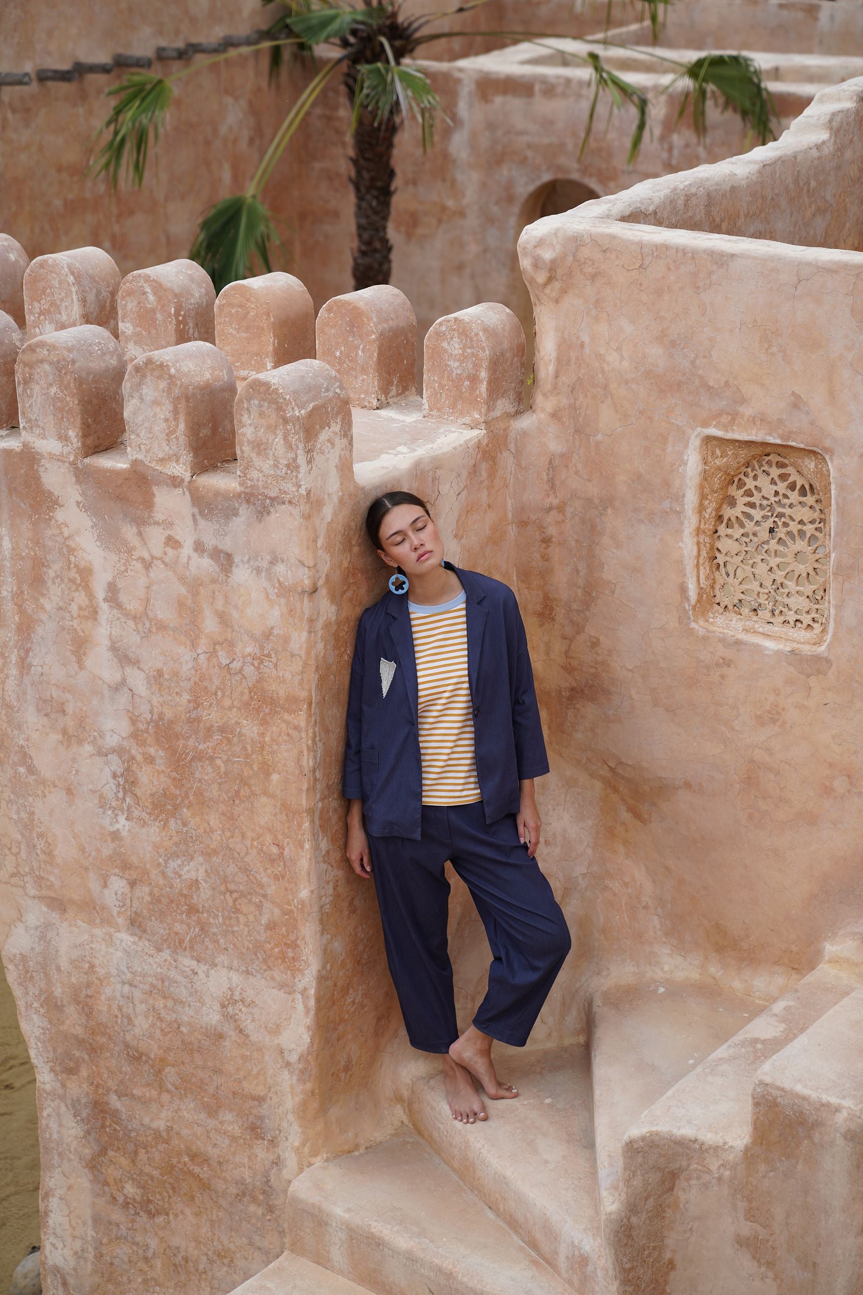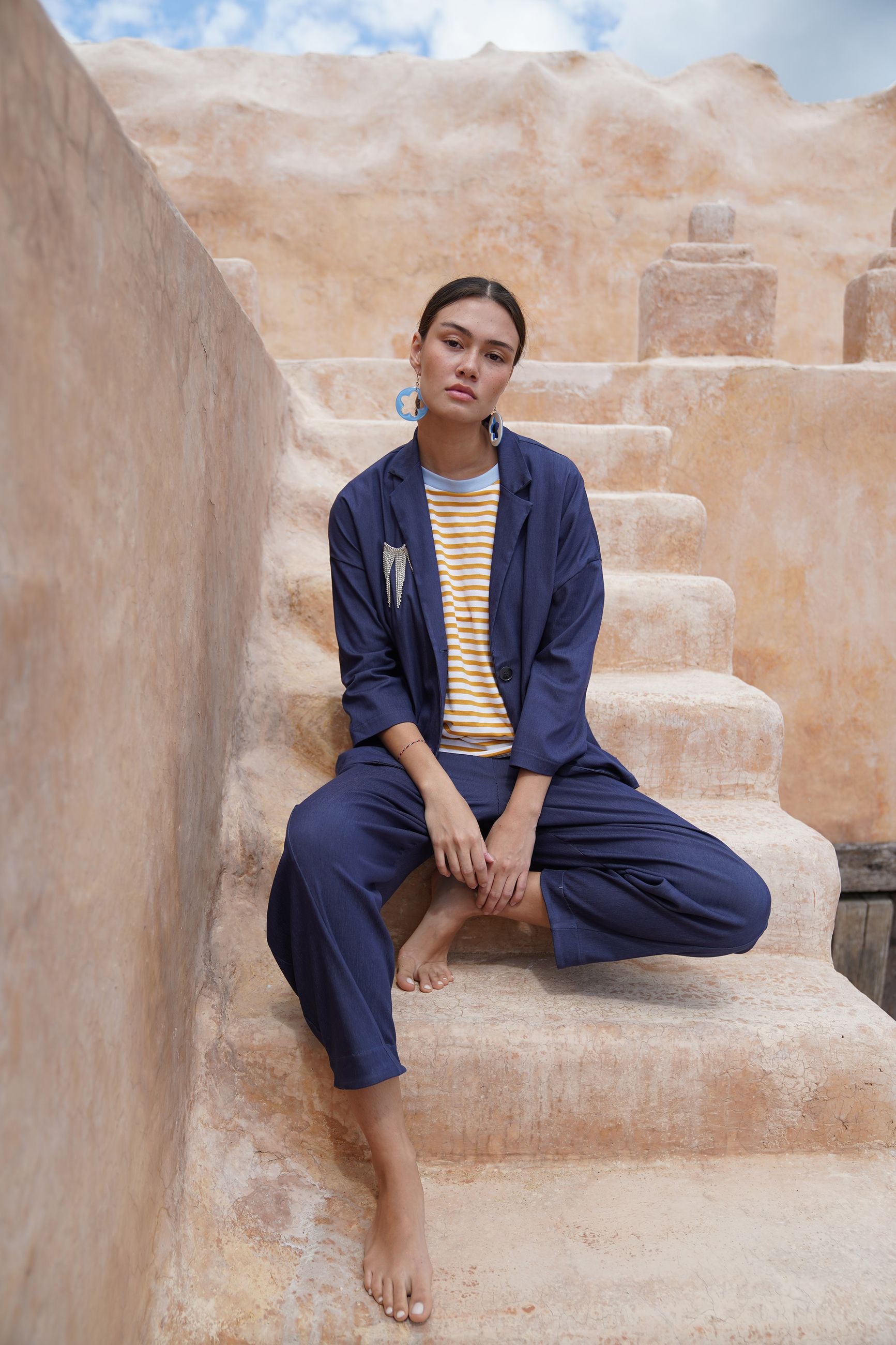 Giacca monopetto dalla vestibilità morbida in bengalina di viscosa elasticizzata effetto jeans. Revers a punta, spalle scese e maniche lunghe. Tasche applicate davanti.
