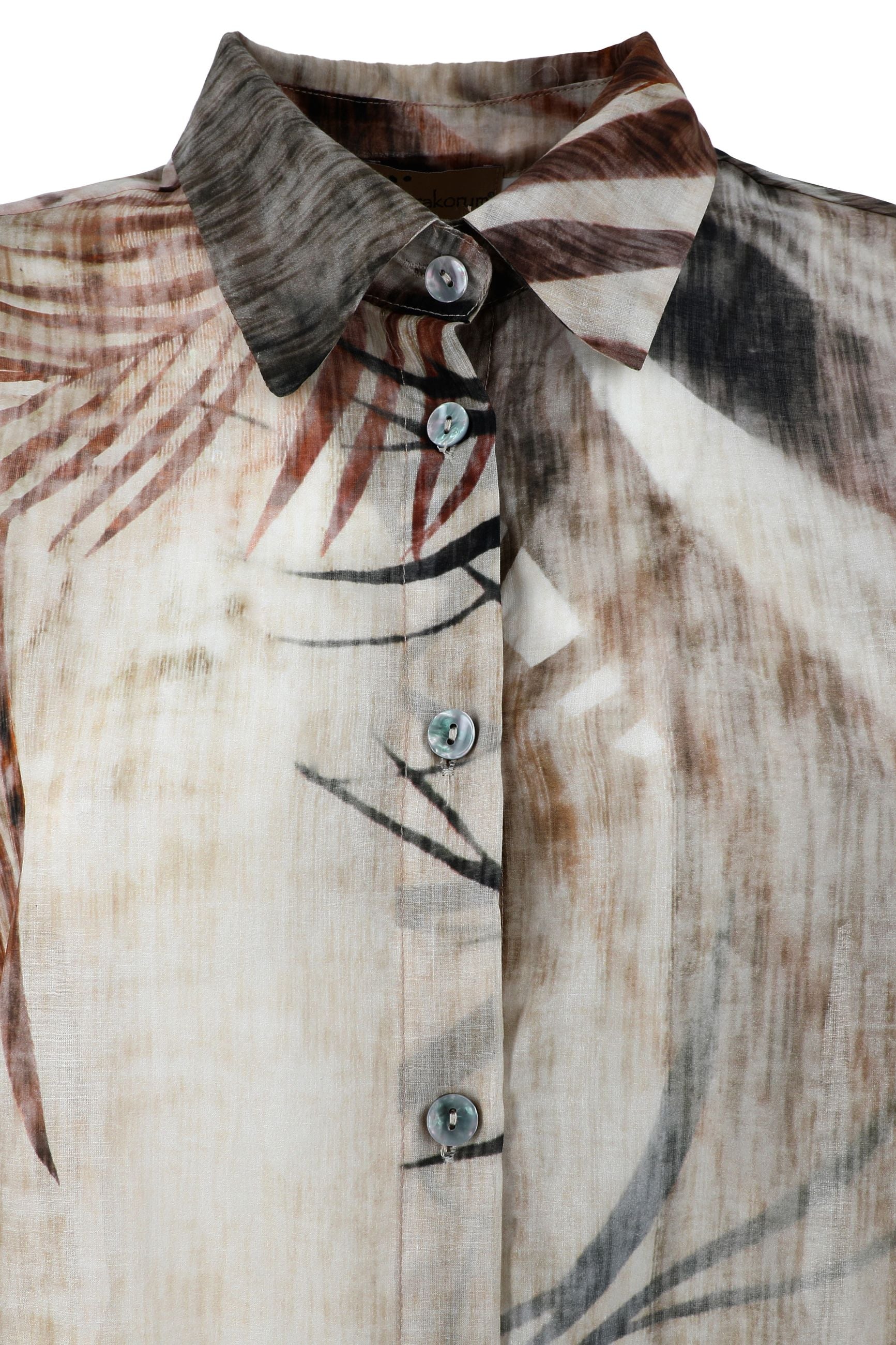Camicia lunga in fresco cotone stampato, semi trasparente, con colletto. Maniche a 3/4 con bottoncini. Apertura davanti con bottoni. Piccolo spacco laterale sul fondo.